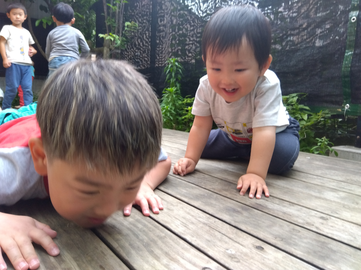 年少児が見つけた石ころを見せると「見ていてごらん、転がるよ」と板と板の間に小石を置き思い切り「フー」と息を吹きかけ転がして見せてくれました。転がったことに驚き、面白いことをしてくれるお兄さんに尊敬のまなざしを送っています。