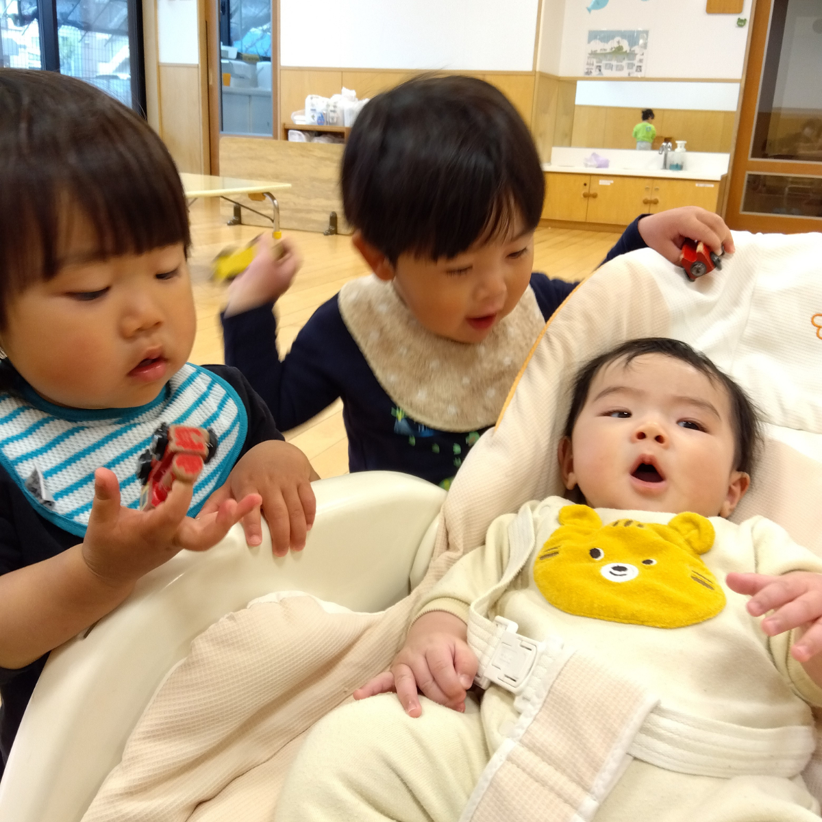 少し前まで僕たちが使っていたラックに新しい友だちが寝ているのに気づき、興味津々で覗きこんでいます。小さな友だちに優しいまなざしを向け、自分の持っていた玩具を貸してあげようとする子もいます。年長児から優しく接してもらった経験から今度は自分たちがやってあげたいという気持ちが芽生えたようです。