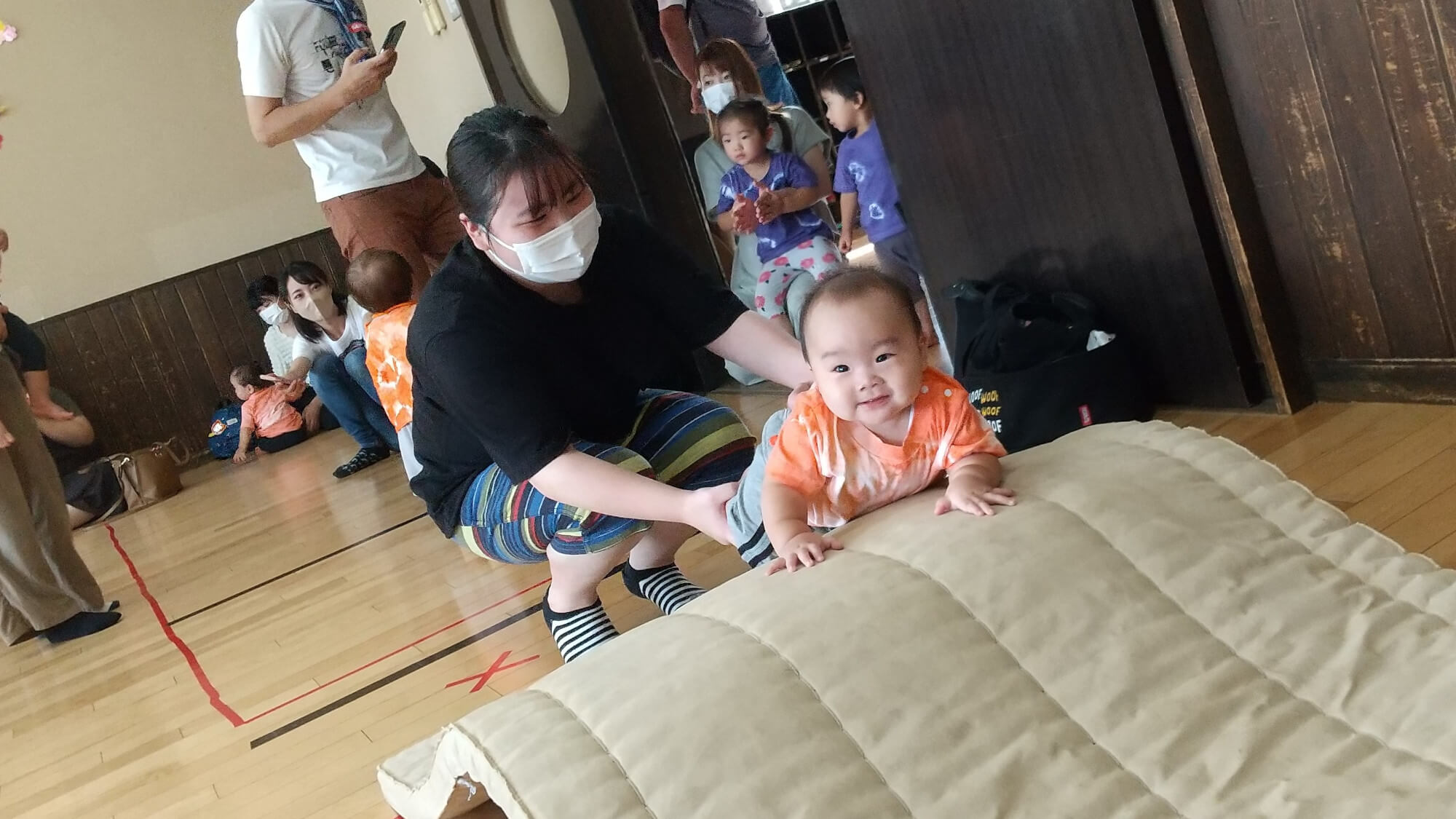 0歳児1歳児クラスはホールにて親子競技を行いました。保護者の方と協力をしながらゴールを目指します。