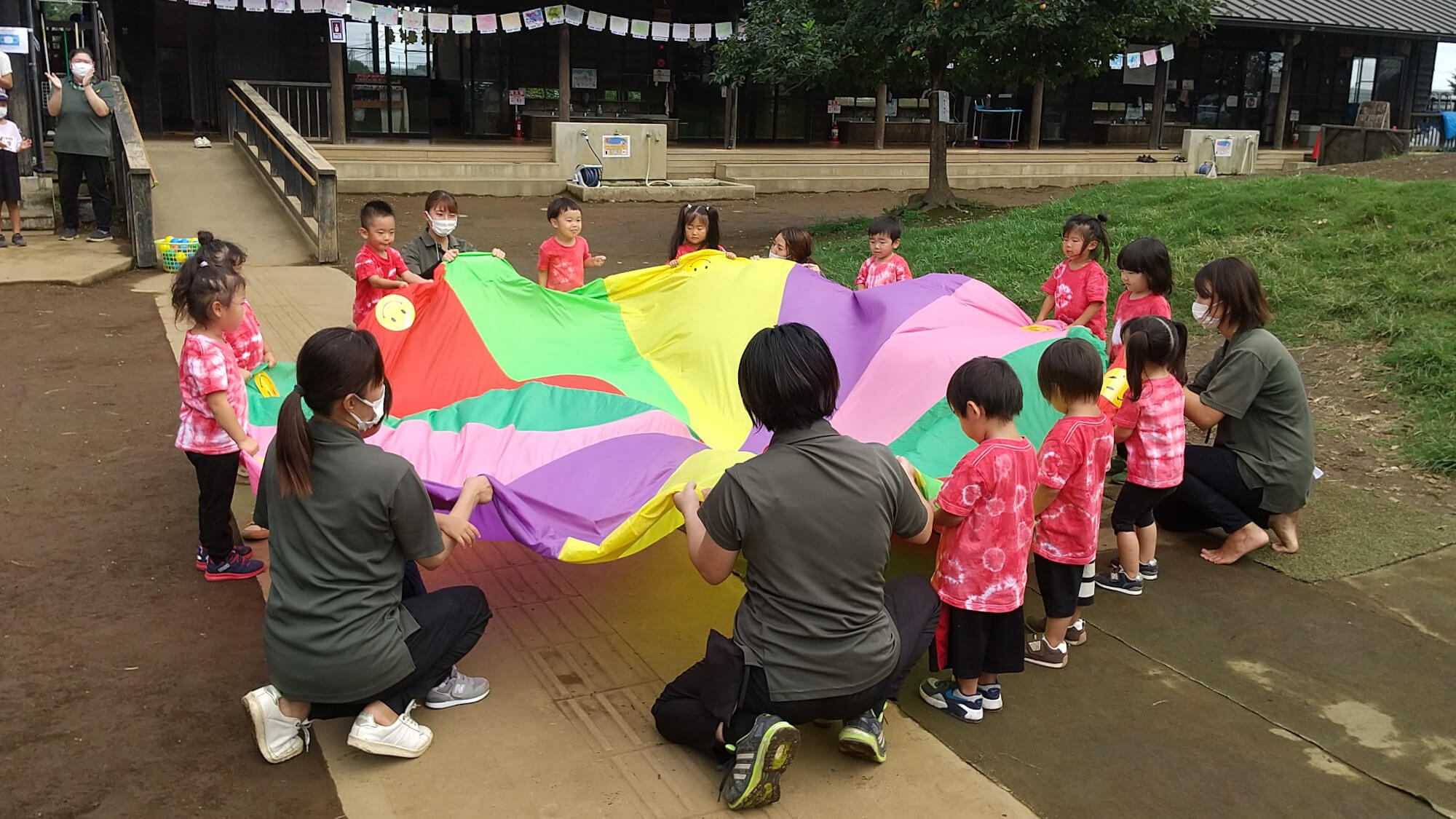 2歳児クラスは散歩先でひもを使って遊んだことをヒントにパラバルーンを行いました。練習からやる気があふれていて、本番は大成功でした。