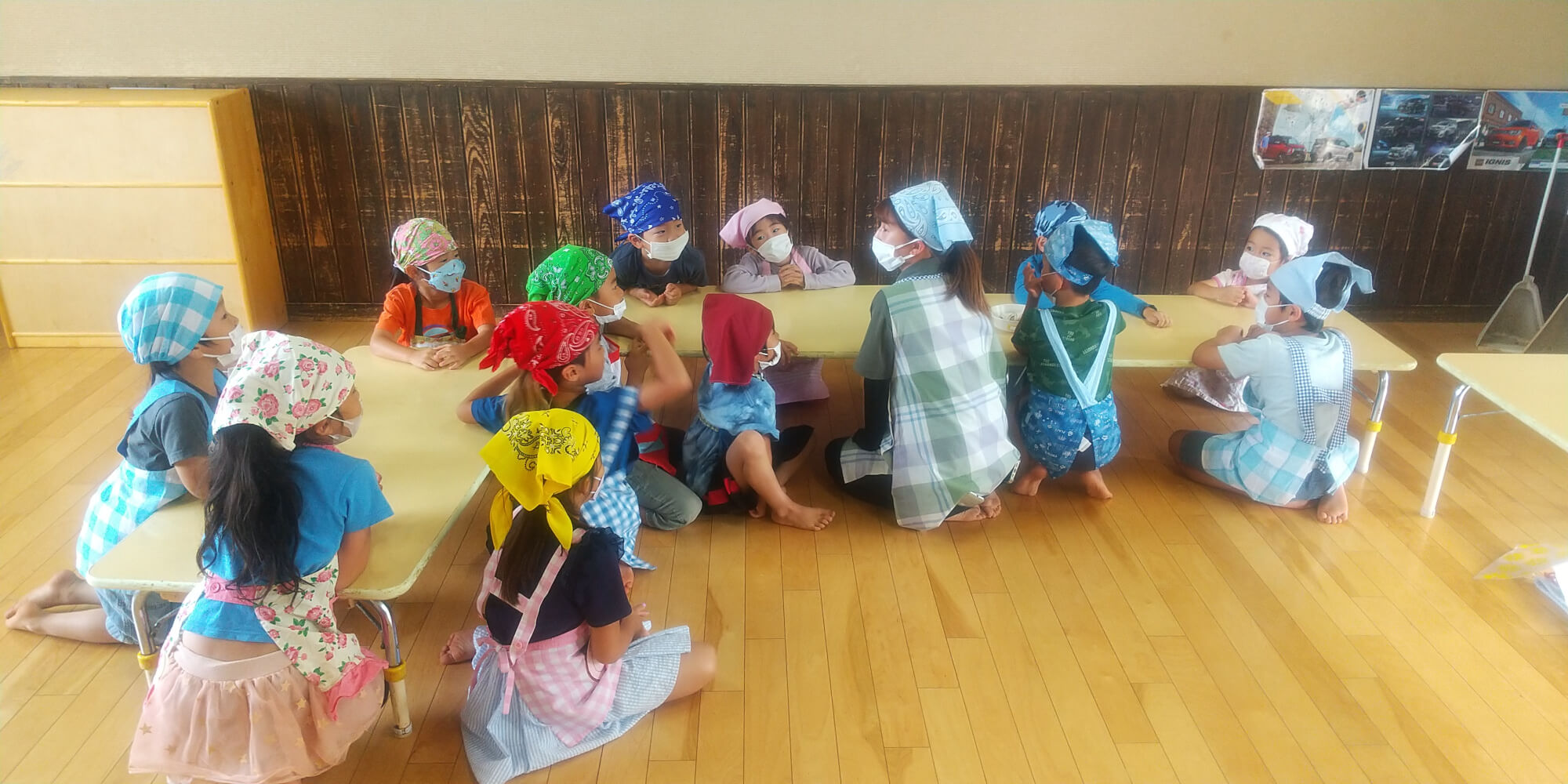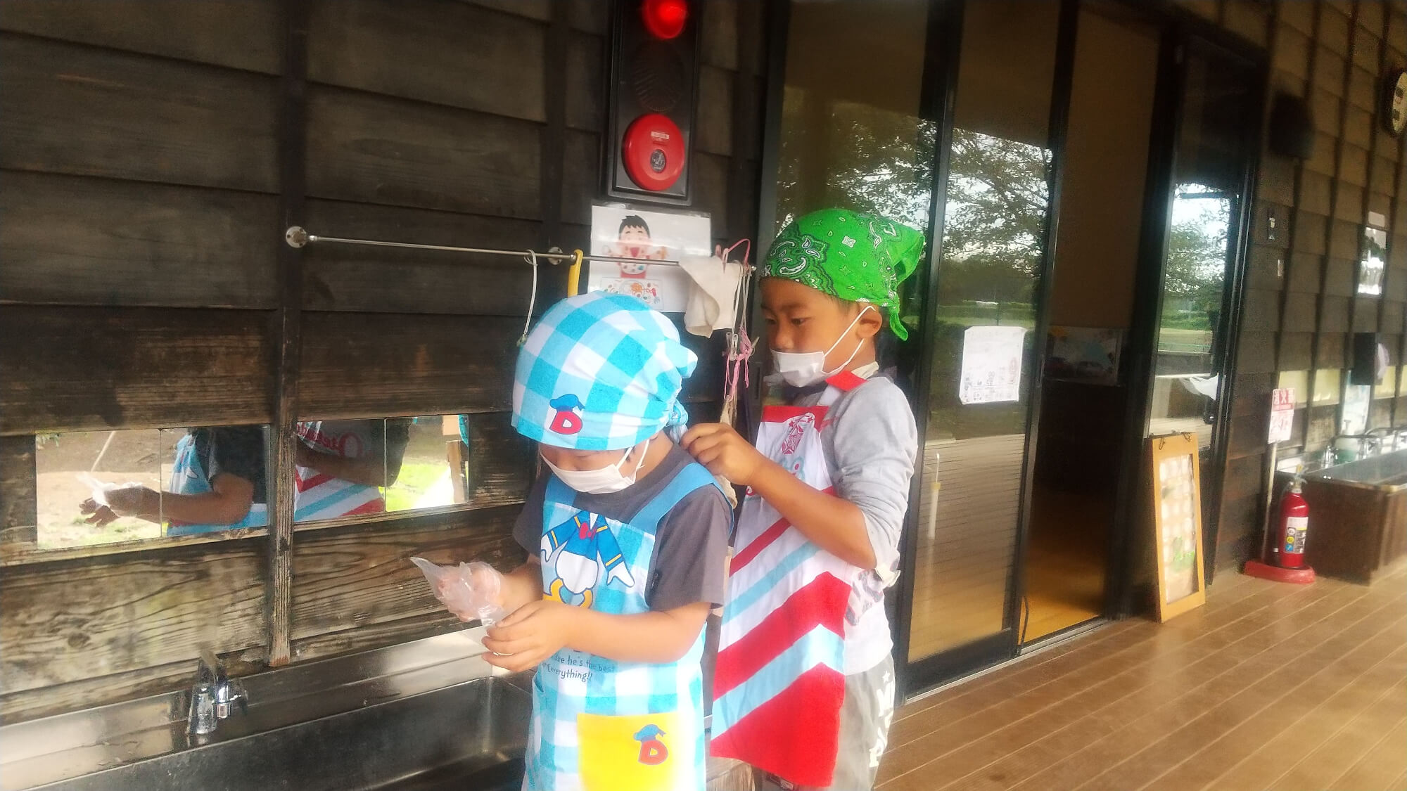 いざ始まる時には、子どもたちの中で「エプロンが着れないよ」「僕がやってあげるよ!」と協力してエプロンを着ていたり、「エプロン着たら手を洗うんだよ!」と率先して友だちに教えたりしていました。