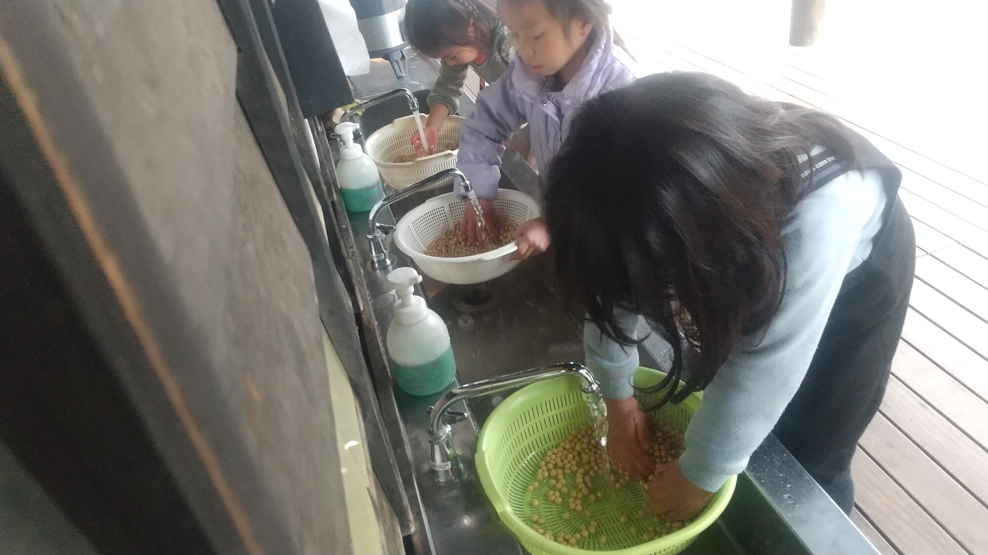 1日目は、子どもたちが相談して、大豆をザルにあける係、大豆を洗う係、洗った大豆を鍋に入れる係の3つに分かれて行う事になりました。