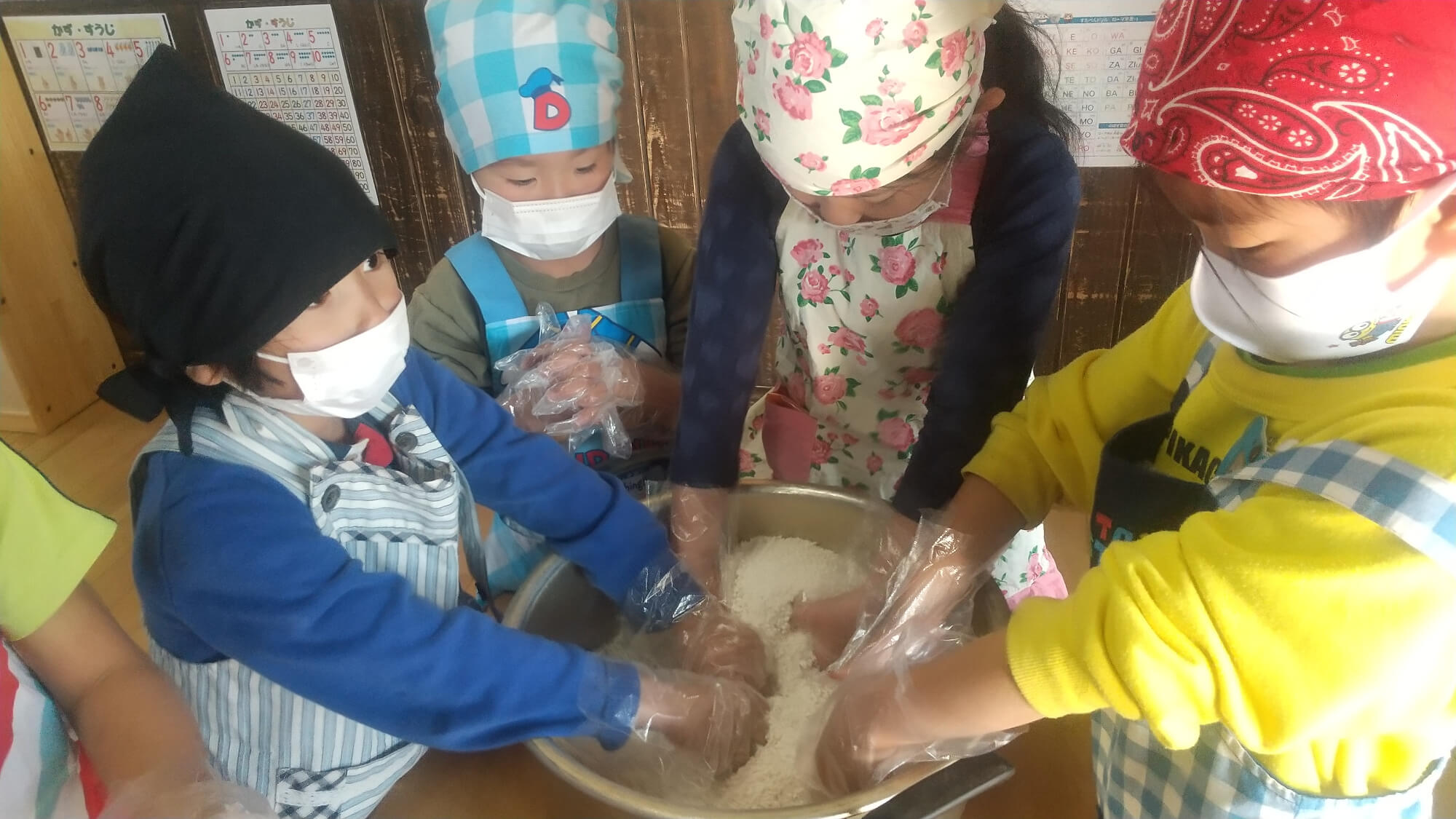 活動を行う前に、「みんなが作る味噌は来年の保育園のお友達のお味噌汁になるんだよ」と話すと責任感が出てきたようで、3日間一生懸命取り組んでくれました。