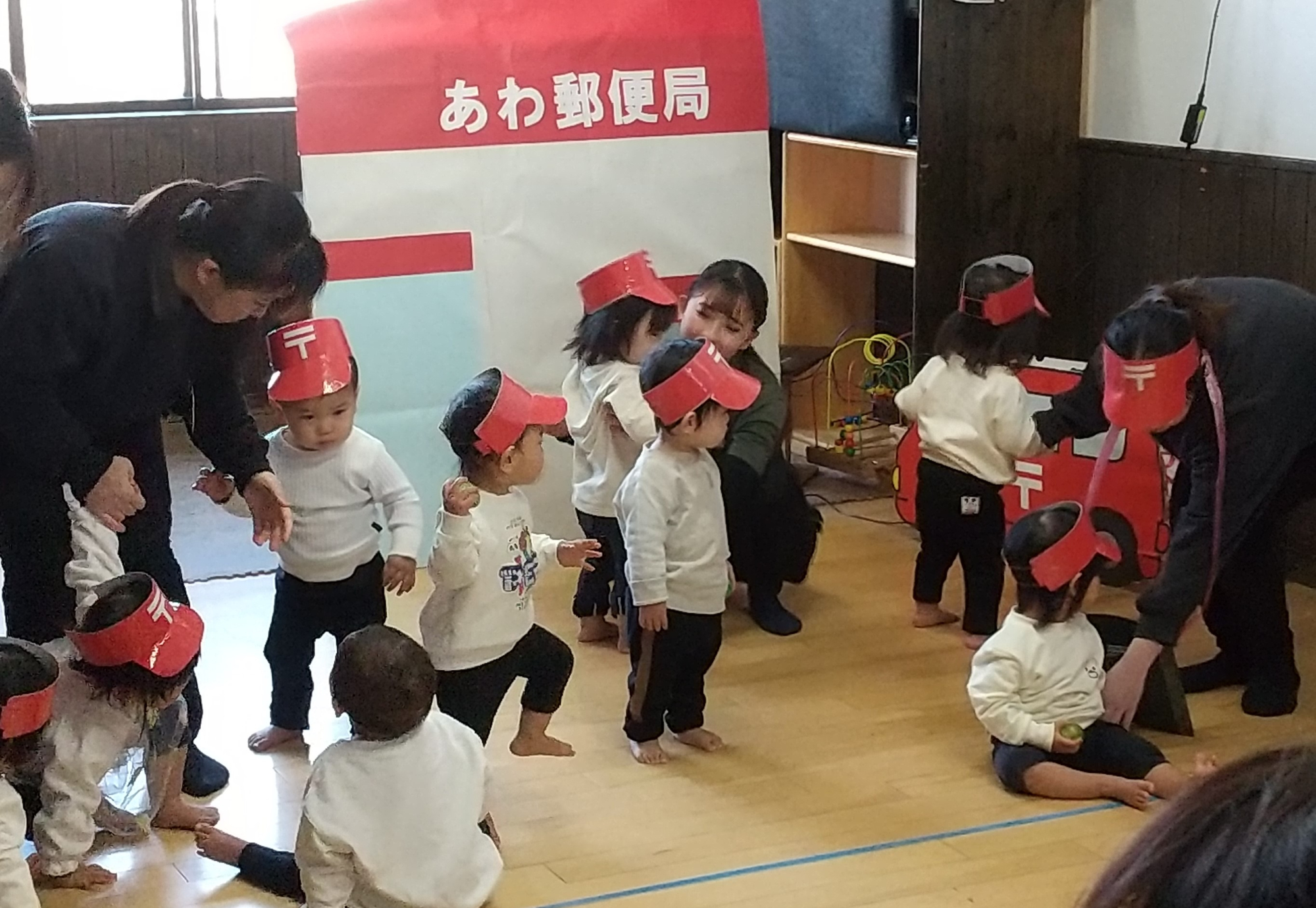 0歳児は郵便屋さんに変身し、お家の方に手紙を届けるという表現遊びを披露しました。