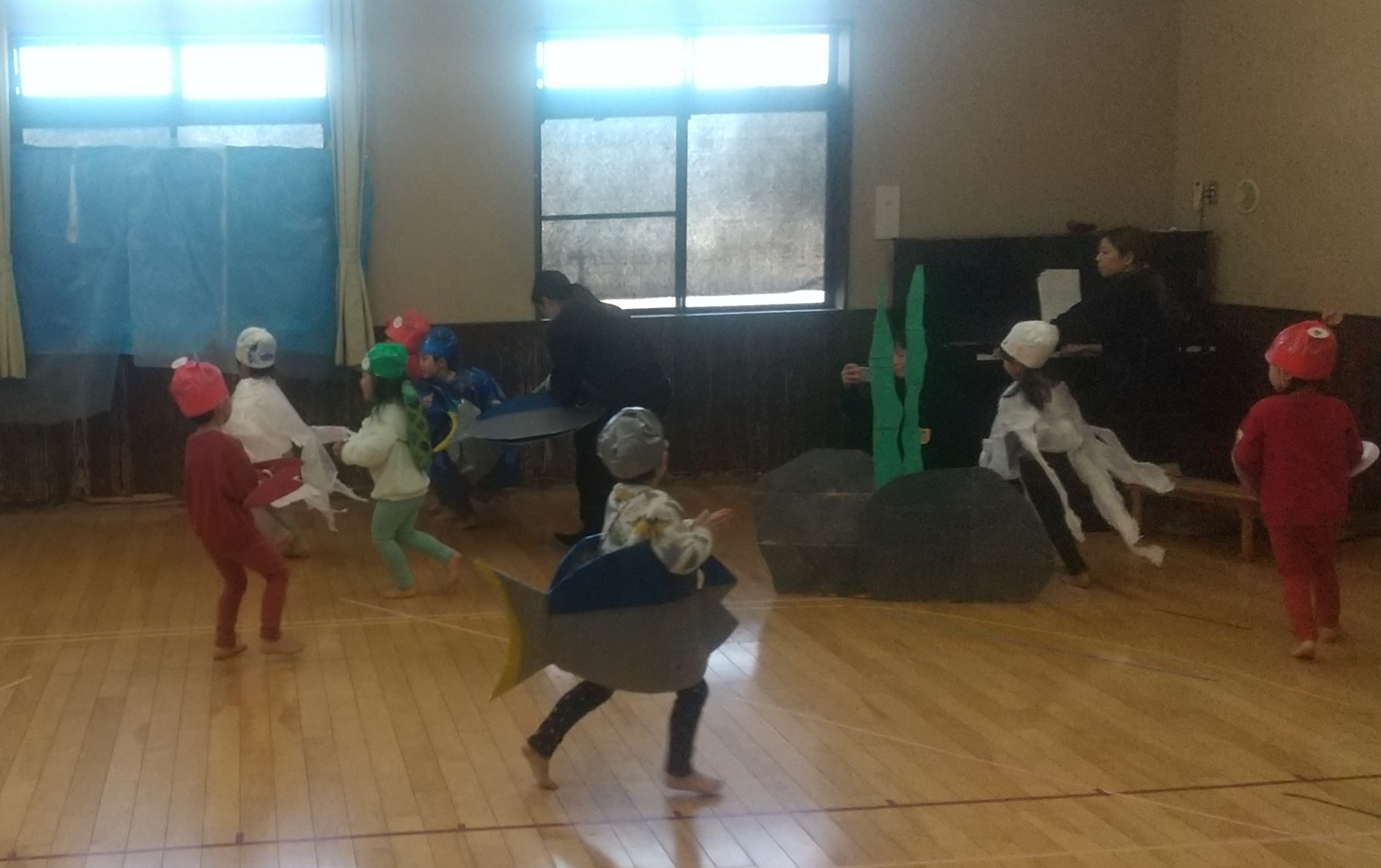 3歳児は、海の生き物になりきり普段取り組んでいるさくらさくらんぼリズムやダンスの発表を行いました。