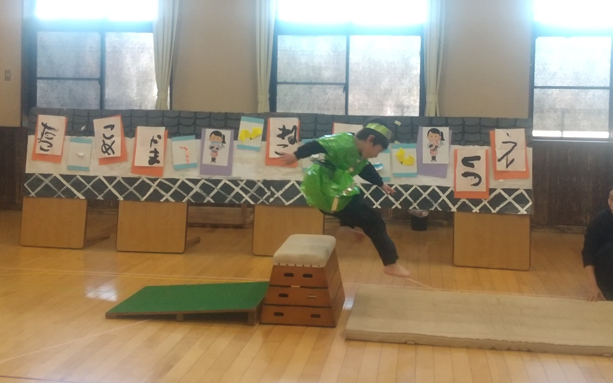 4歳児は、忍者になりこめ組になるための様々な試練に挑戦するという表現遊びを披露しました。