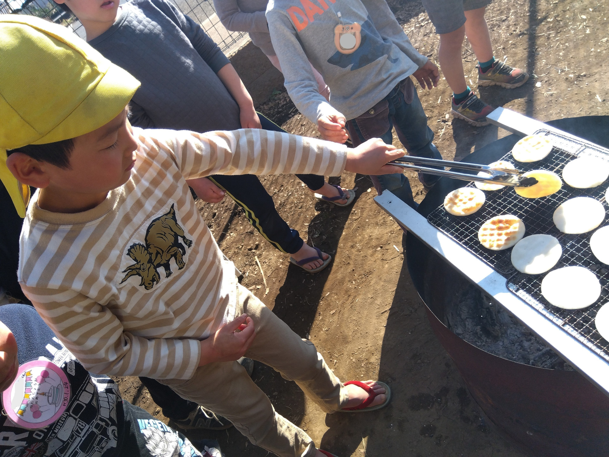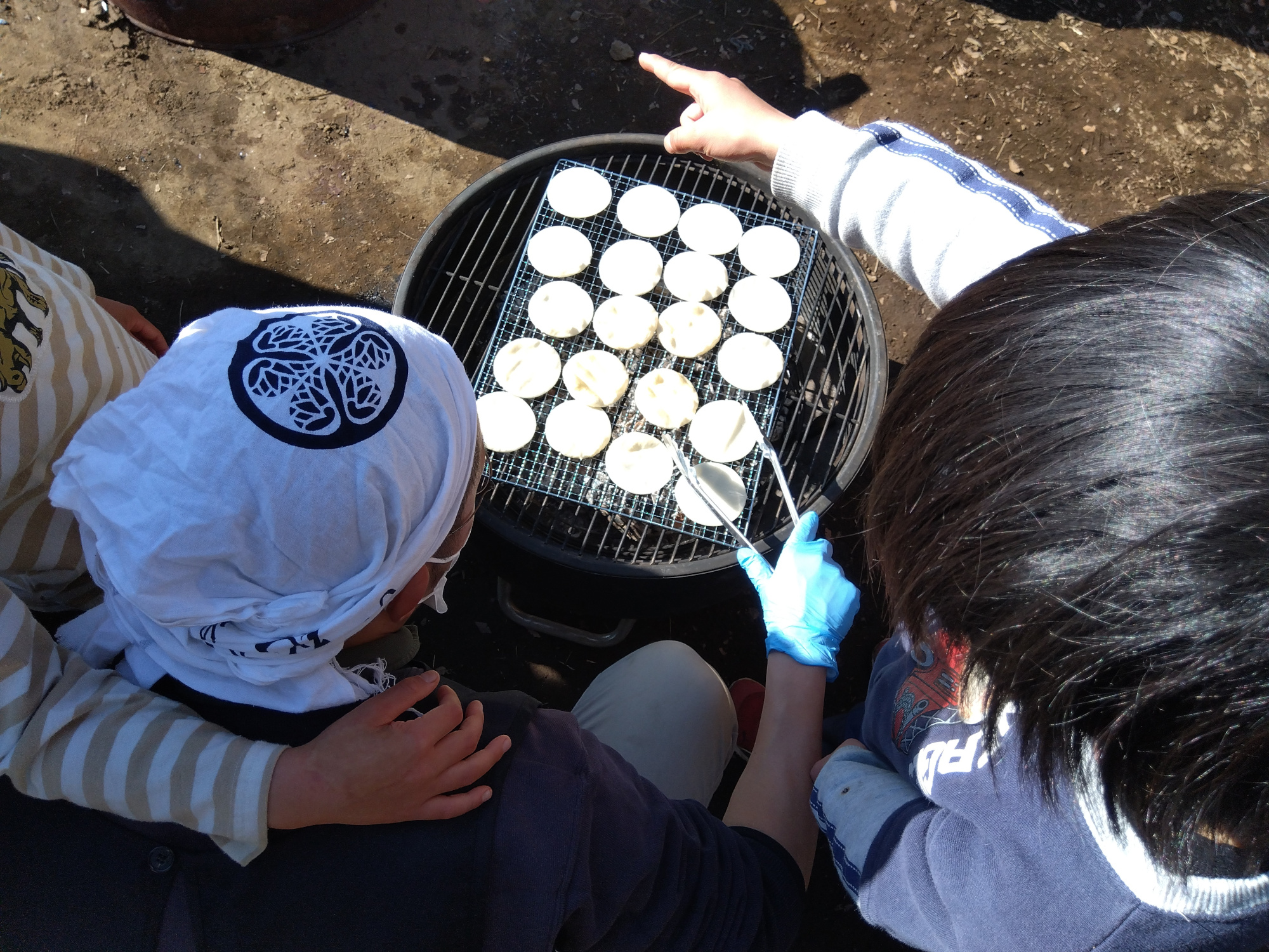 焼けるせんべいを見守る子どもたち