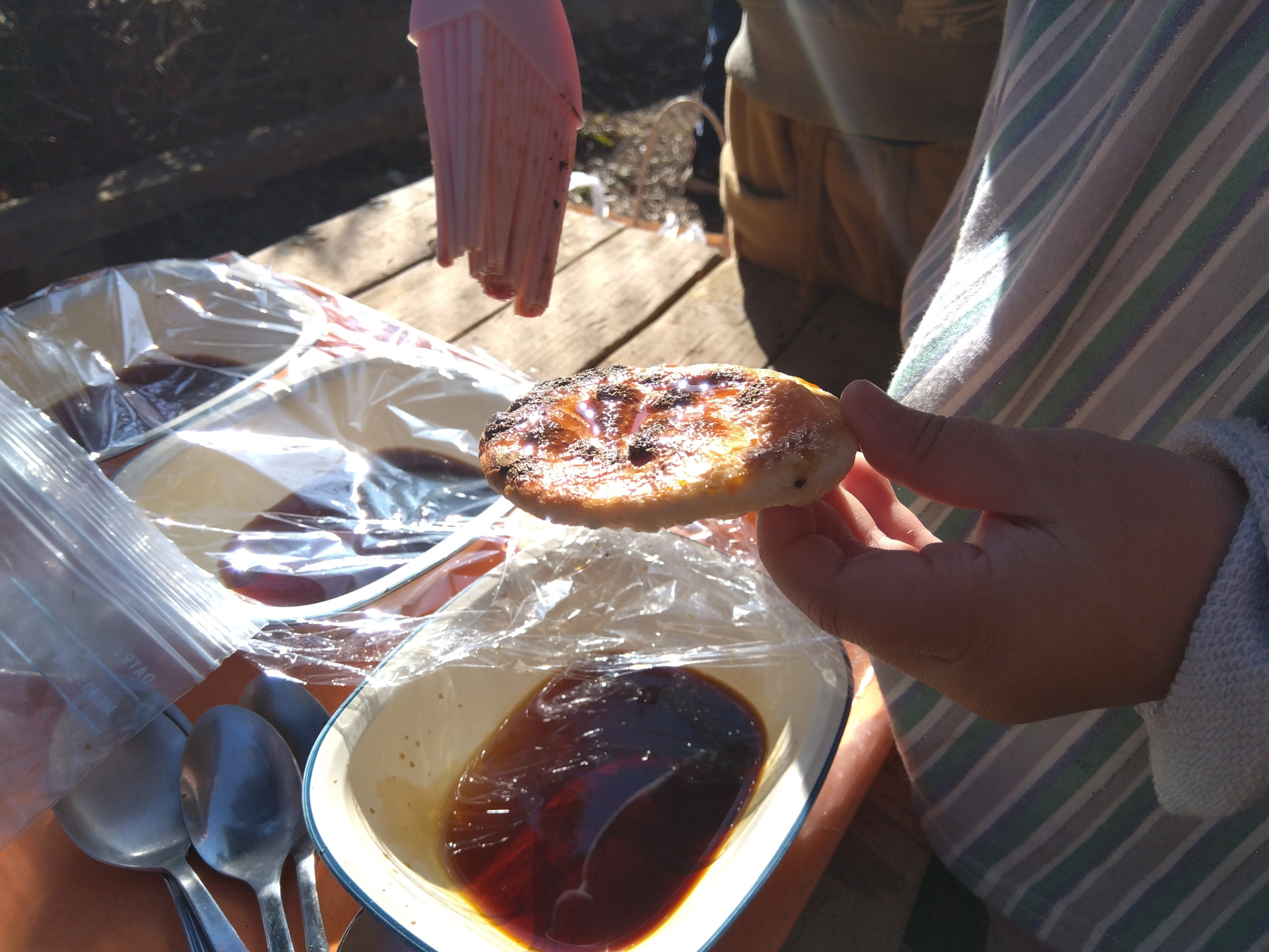 せんべいのふくらみを頼りに何度かせんべいをひっくり返すと次第に園庭には香ばしい匂いが広がっていきました。両面にこんがりと焼き目が付いたせんべいに醤油のたれを塗ってせんべいの完成です。