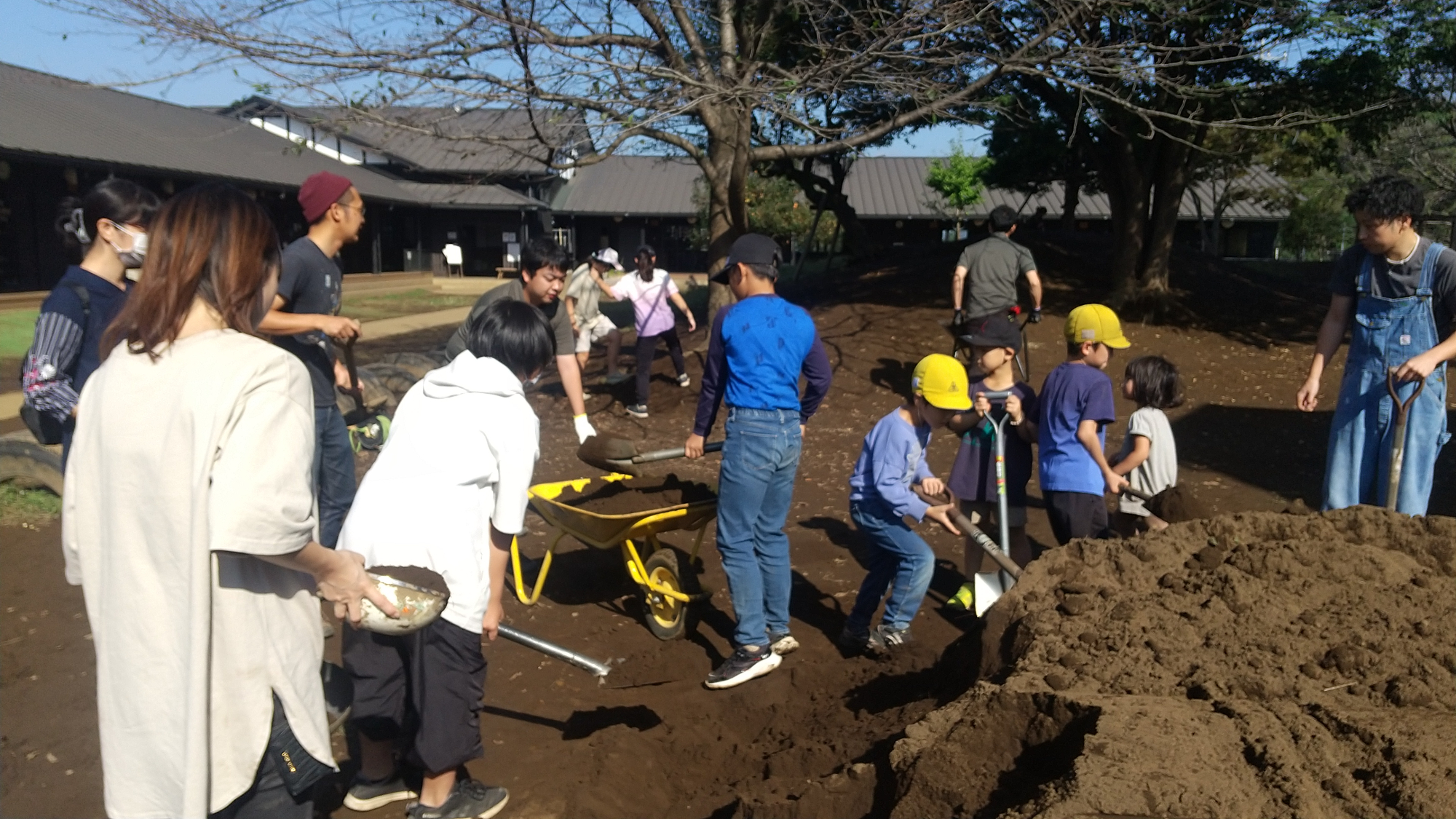 一輪車にスコップで土を入れたり、普段土遊びで使っている玩具を使って土を運んだりしましたよ。また土を盛り終わったところには、足で踏み固めて土が定着できるようにしました。