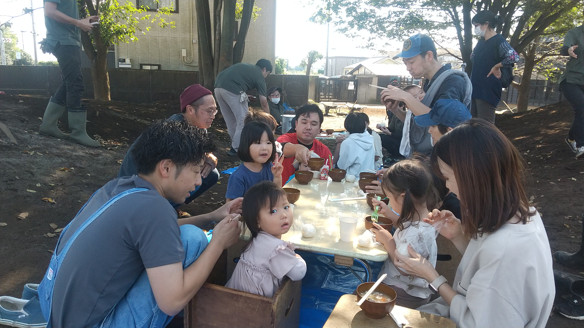 最後に職員と学童のお母さん、学童児が作った豚汁とおにぎりをみんなで食べました。
