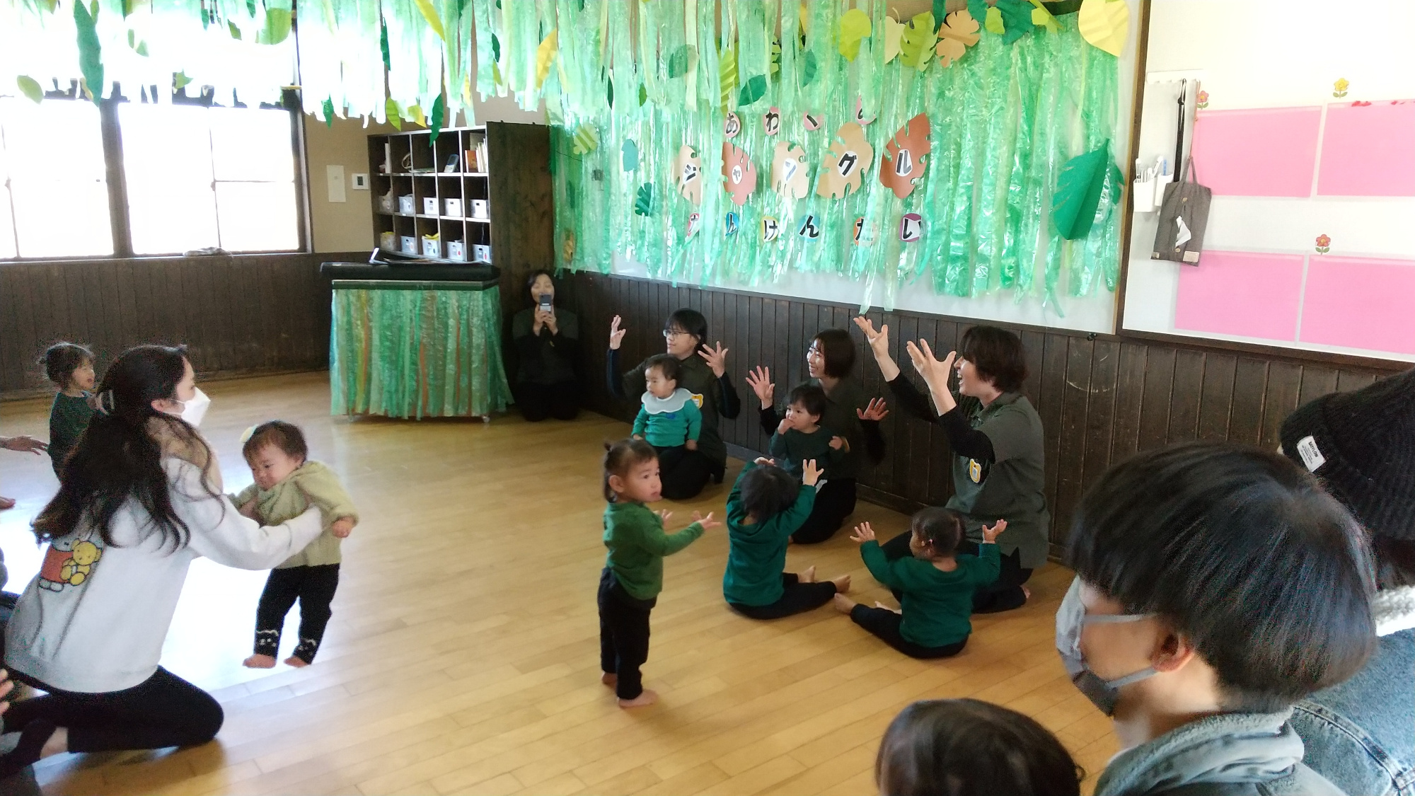 昨年は泣いて参加できない子どもも多くいましたが、今年はほとんどの子どもたちがいつもの姿を保護者の方に見せることができました。