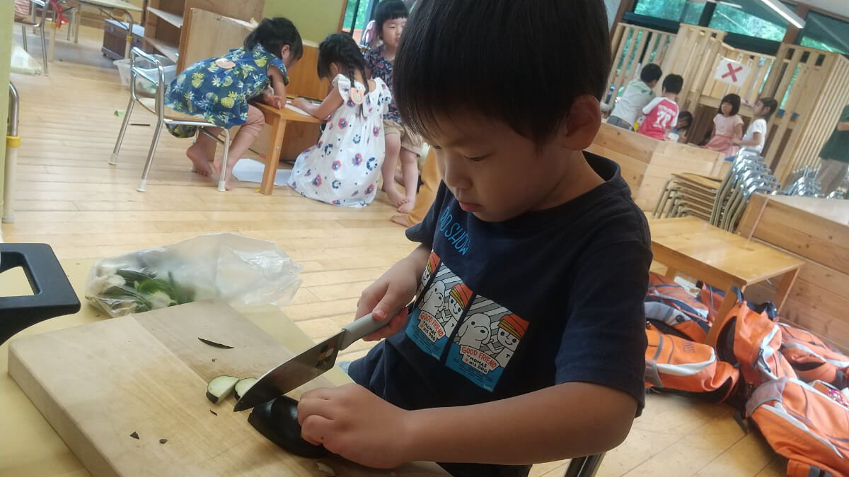 さて、食欲のほうもますます実りを見せ、畑で収穫した野菜で自らお料理をする姿もありました。自分で包丁を握り料理をしていると、いい匂いにつられて自然とまわりに人だかりができています。少し苦手な野菜も「美味しい!」といいながら手を伸ばしています。
