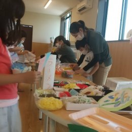 商品つくりではお花紙や折り紙、画用紙など様々な素材を使って友達や保育者と相談しながら、それぞれの店に並んでいた商品を思い出しながら製作を楽しんでいました。