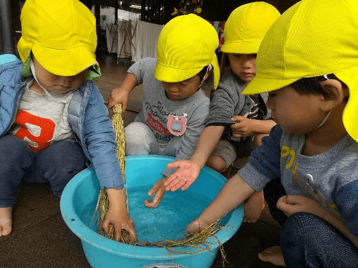 まずは、水につけて藁を柔らかくします。「本当に柔らかくなるのかな?」と半信半疑な子どもたちでしたが、興味津々で水に藁をつけていました。