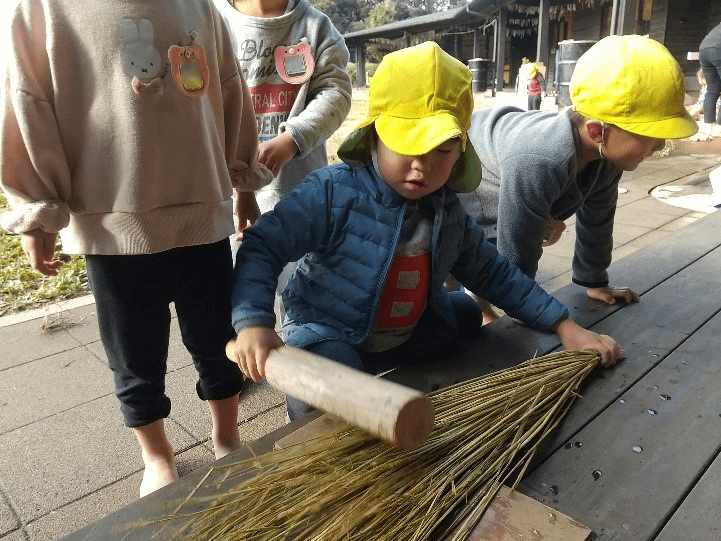 次に木槌で藁を叩きます。「重たい~」と言いながらも、力強く藁を叩いていました。周りの友だちも「気を付けてね」「大工さんみたいでかっこいいね」と応援の声を掛けていました。