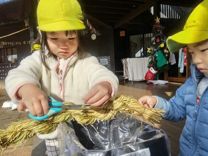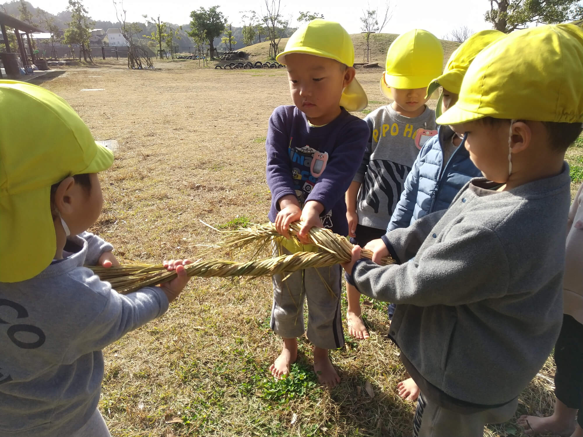 一宮どろんこ保育園では、秋に米を収穫した後、藁を用いてしめ縄作りをするのが恒例になっています。今年も正月に向けて、しめ縄作りを行いました。