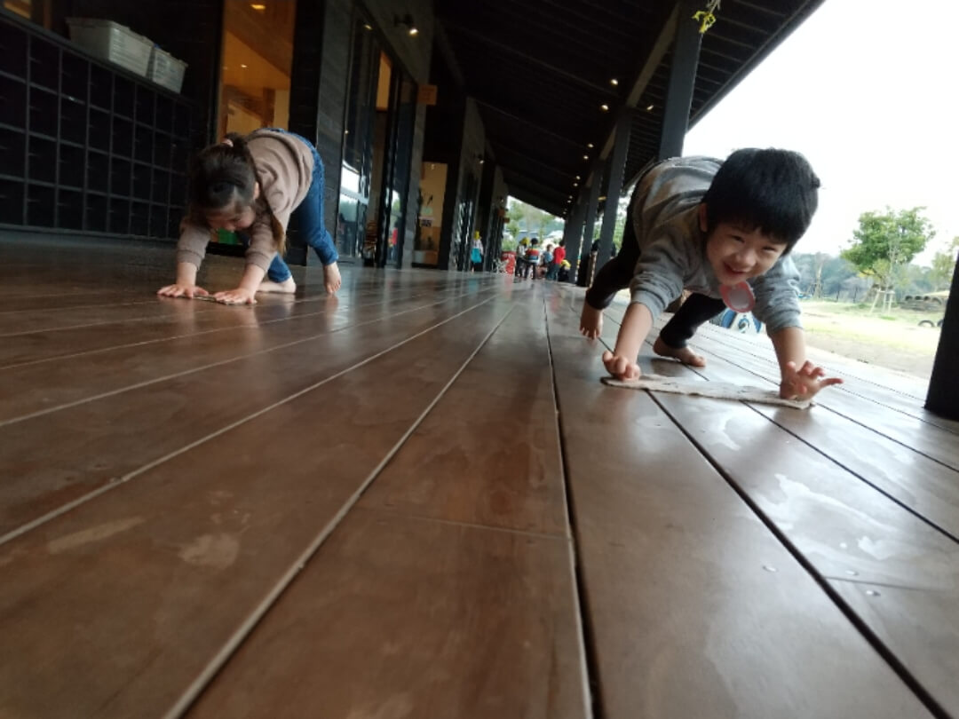 一宮どろんこ保育園の縁側でぞうきんがけ