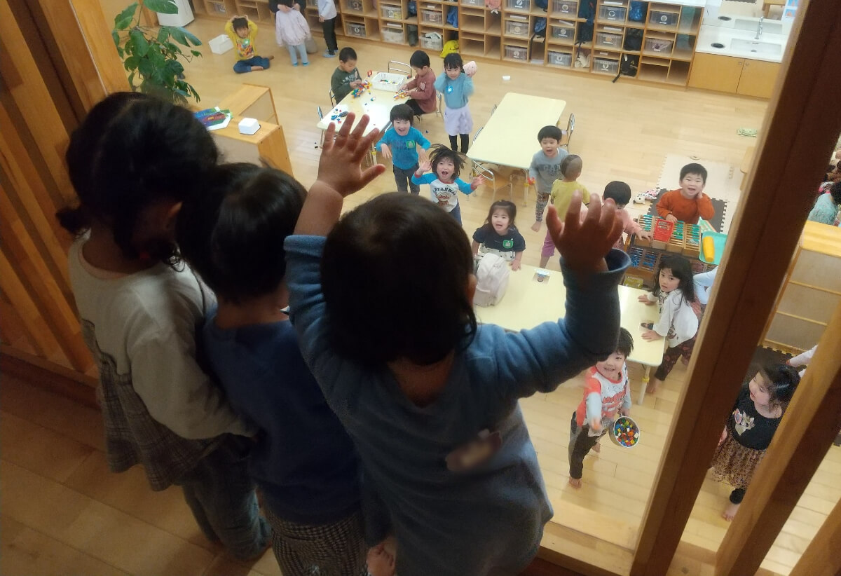 幼児保育室の二階にはキャットウォークがあります。園舎の真ん中、遊戯室にも繋がっており、乳児が園内探索に行くと一階の幼児室にいる子どもたちと手を振り合い、異年齢での関わりが見られています。
