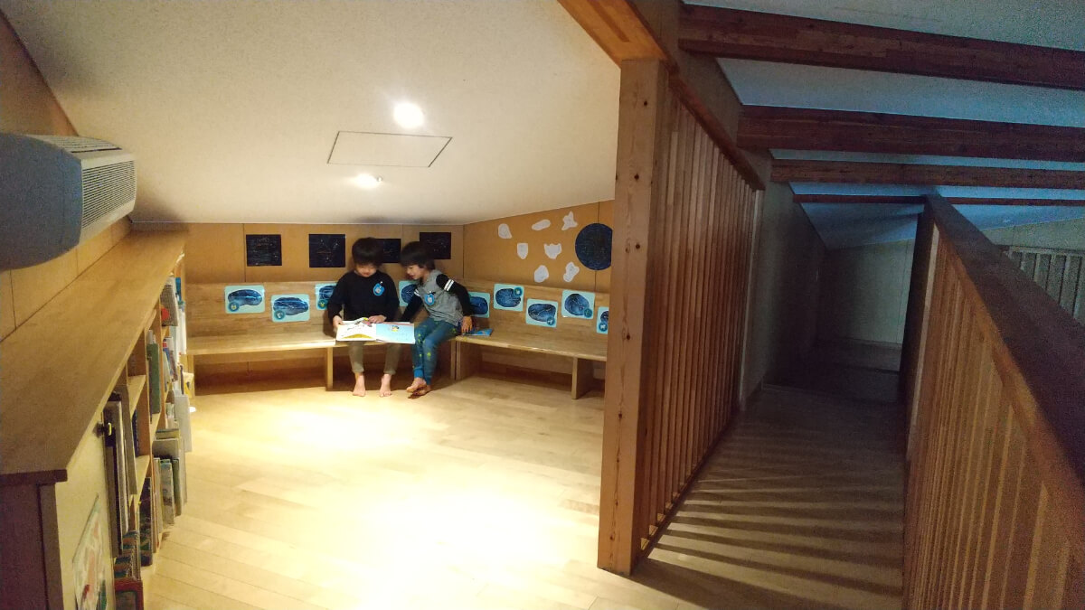 遊戯室上のキャットウォークには絵本コーナーもあり、静かな空間の中で好きな絵本を見つけて読んでいます。