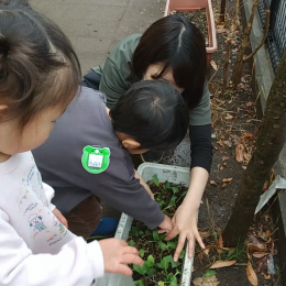 あずき組では最初、絵本を通して歯磨きの大切さを伝えました。一人ひとりが真剣に話を聞き、「これは○○の歯ブラシ!」「こうやるんだよね」など友達同士で話したり、「どうやるの?」と保育者に聞いたり、実際に歯ブラシを持ったりしながら楽しく取り組んでいました。
