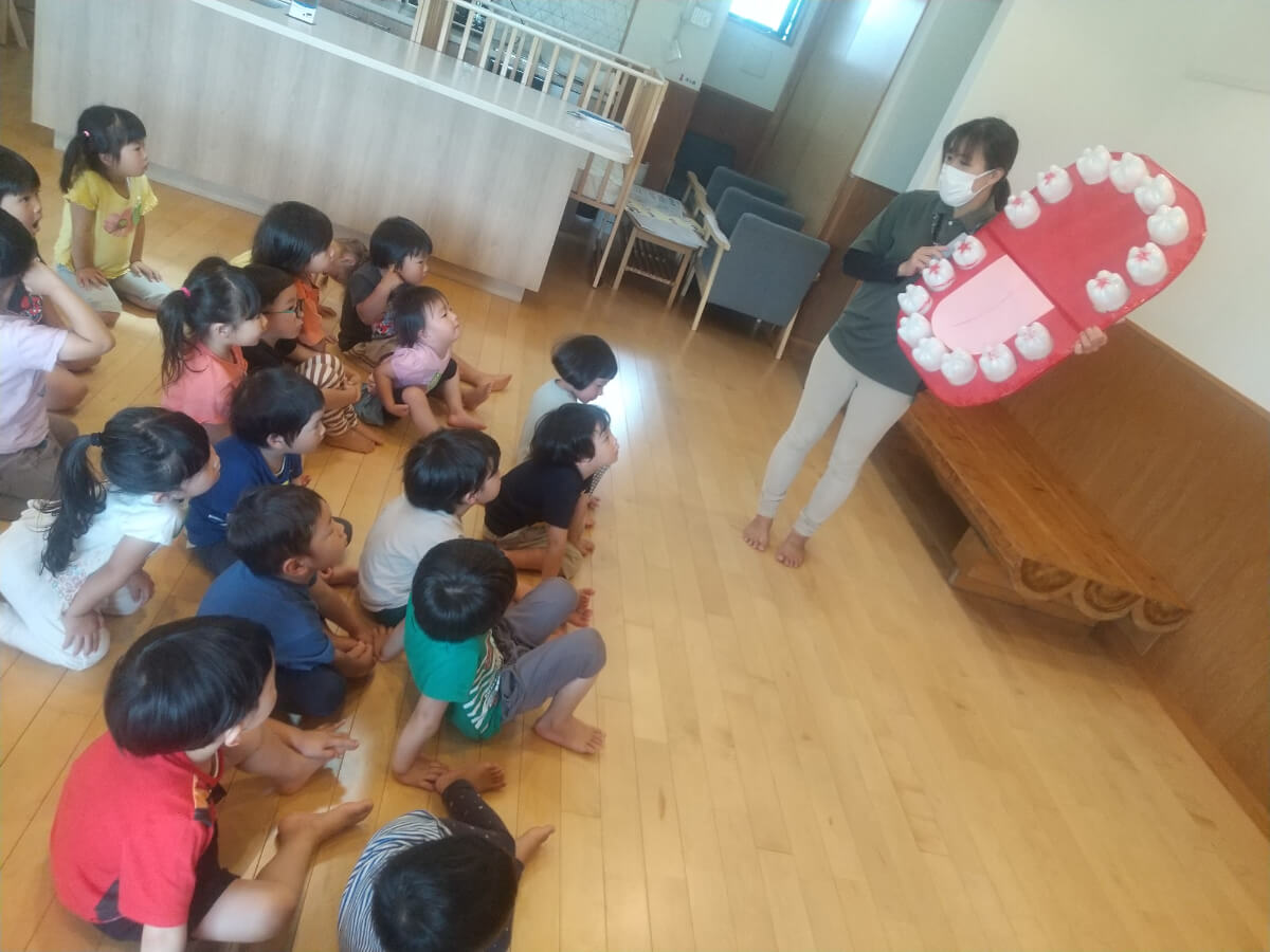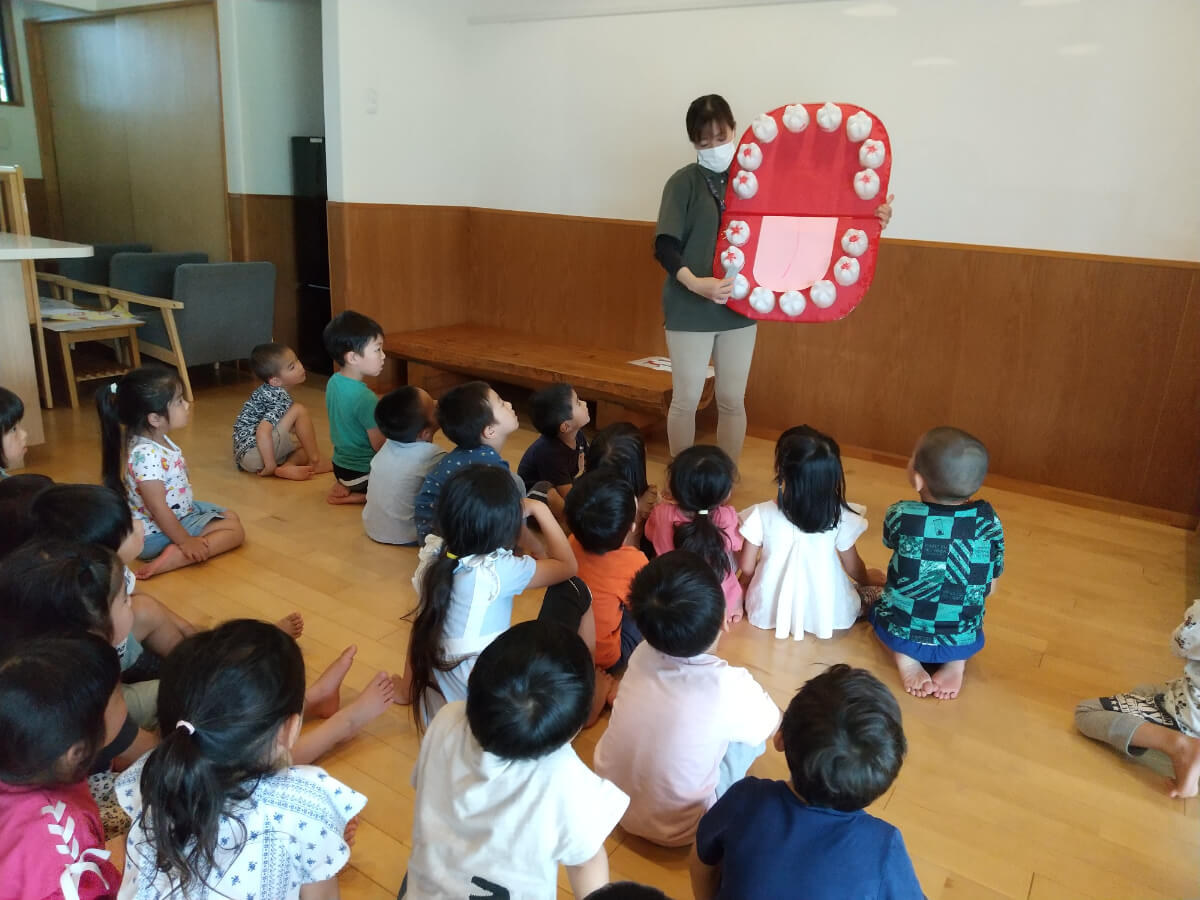 幼児クラスでは大型の模型を使い、歯ブラシをどのように使って磨いたら良いのか、クイズや模型を使って実際に行うことで理解を深めました。子どもたちは歯について興味を持ち、真剣な様子でした。