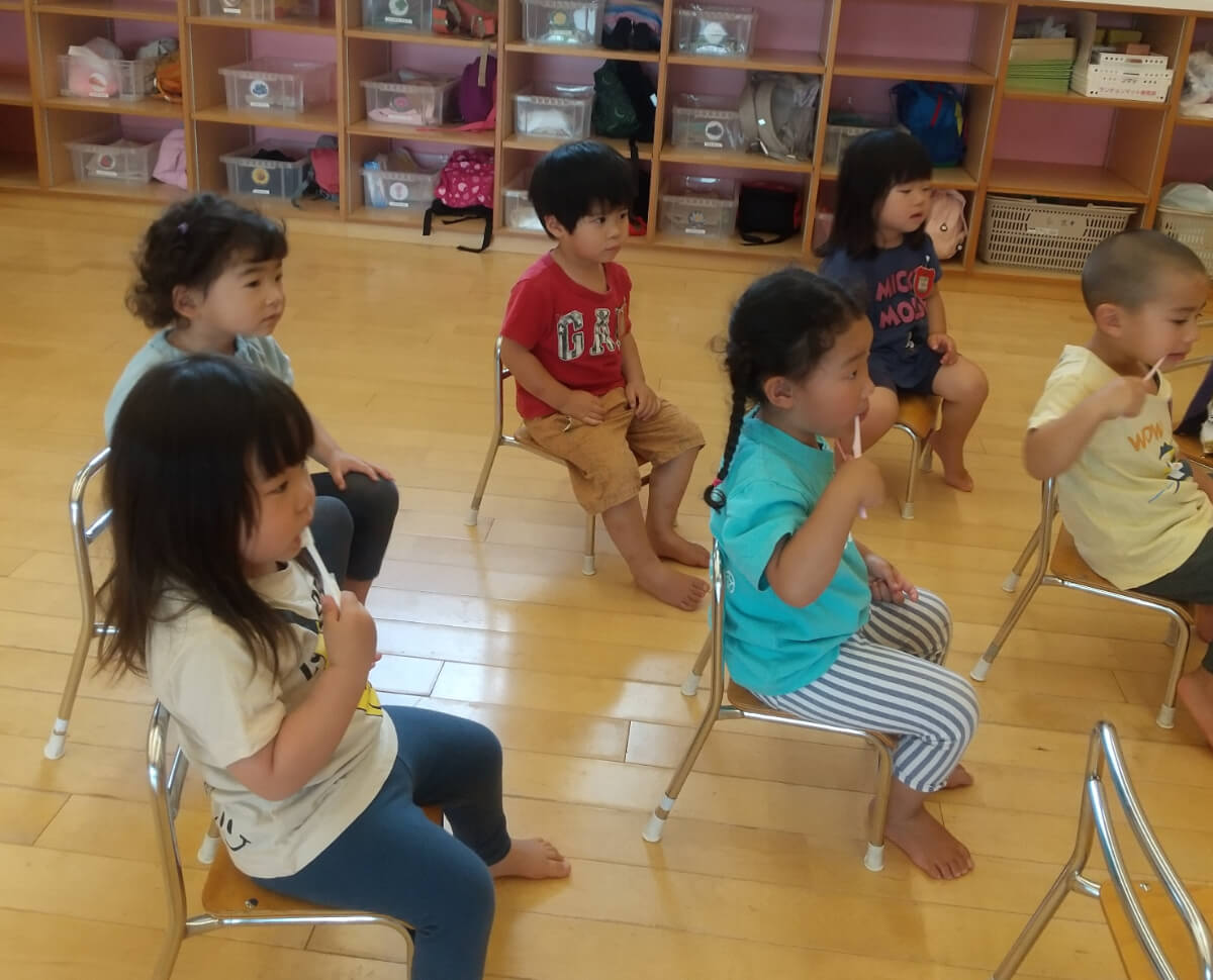 給食後の歯磨きでは、友達同士で歯科指導の内容を思い出しながら磨いている様子が見られました。普段、園や家庭で食事後に習慣として何気なく行っている歯磨きも、今回の歯科指導を通して再確認し、子どもたちも意識して歯磨きに取り組んでいる様子がうかがえました。