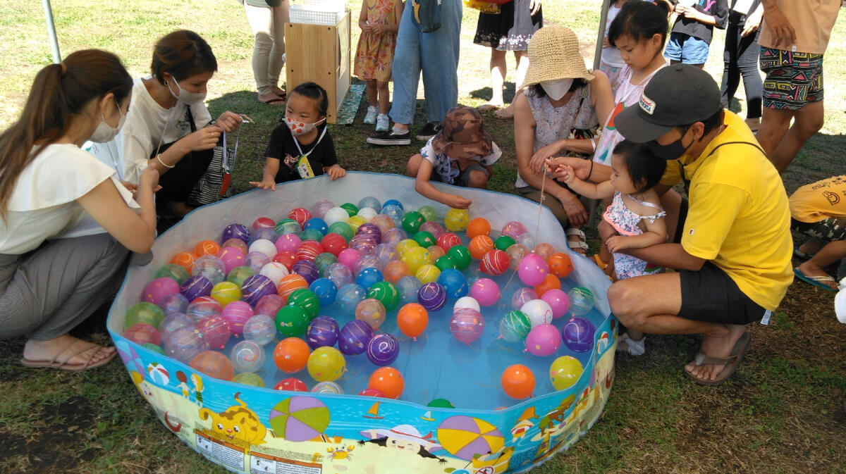 次はヨーヨー釣りの様子です。カラフルなヨーヨーに子どもたちは目を輝かせながら「あれがいい!」「ぼくは青を釣りたい」と、狙いを定めて慎重に取り掛かっていました。お目当てのヨーヨーが釣れると嬉しそうにお家の方に教えている姿がほほえましかったです。