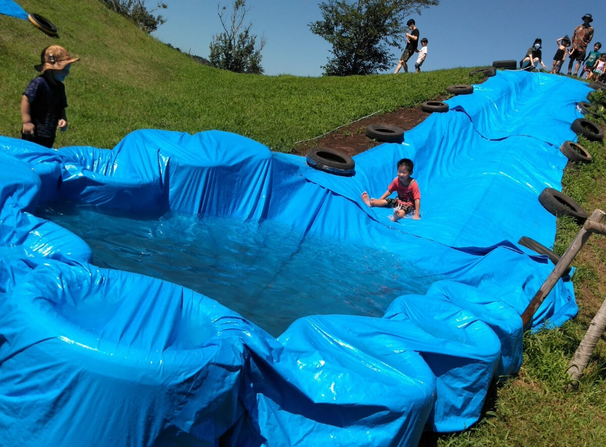 高さ5mのスライダーは勢いが良く、そのスピード感に「きゃーっ!」「気持ちよかった!」「もう一回やりたい!」と賑やかな声が響いていました。他にもスプリングラーや塩ビ管シャワーを用いた水遊びも行い、夏ならではの光景が広がりました。