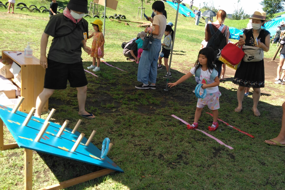 輪投げの様子です。子どもたちで投げる距離を選べる事で、年齢に応じて楽しめるようにしました。狙った所に輪が引っ掛かると「やったー!」と黄色い声が上がりました。