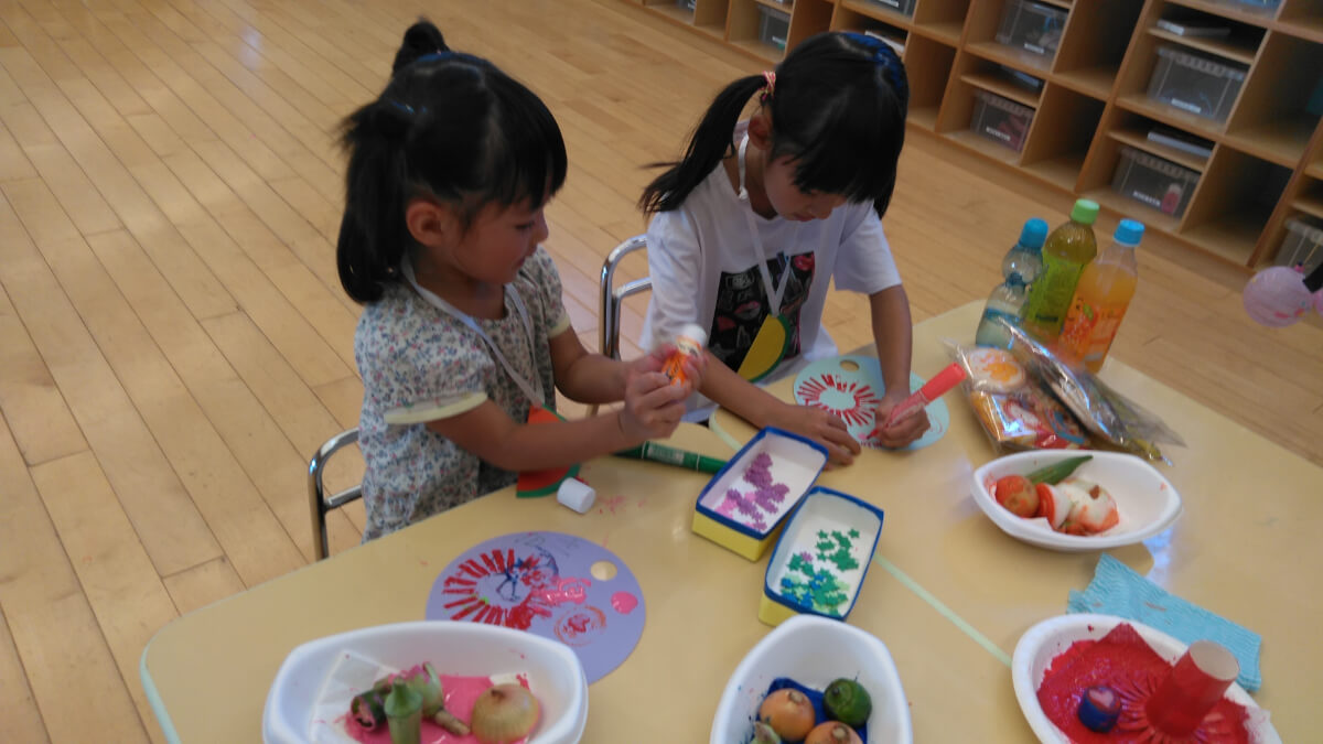 ワークショップでは自分の好きな色のうちわを選び、野菜スタンプやトイレットペーパーの芯で作った花火柄スタンプ、カラーペン等で自由に模様をつけていきます。完成したうちわを友達と見せ合う姿もあり、世界に一つだけのうちわが出来上がりました。