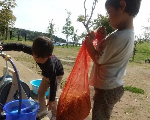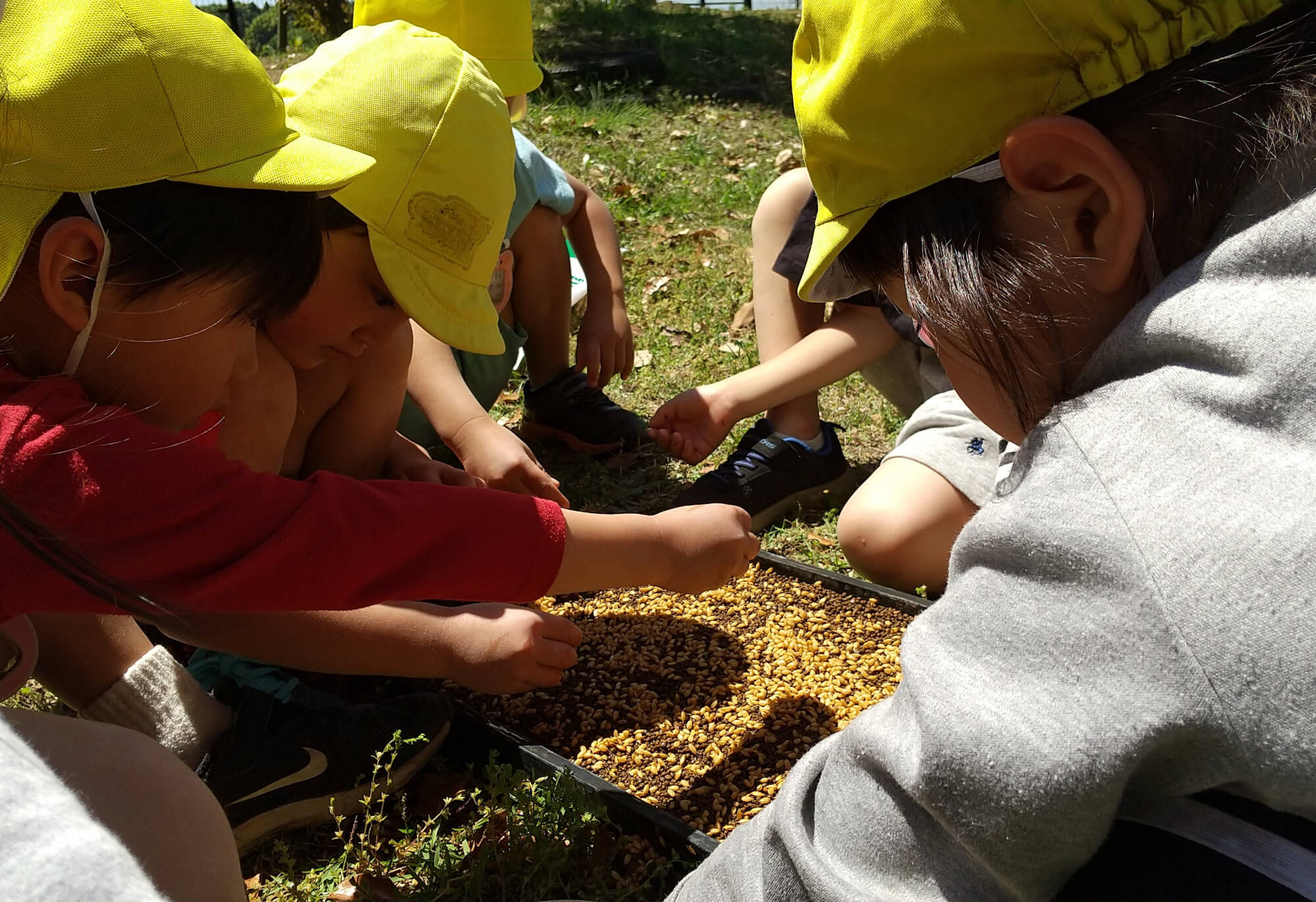 まずは田植えのために苗を育てていきます。昨年の種籾(たねもみ)を保管し、今年の田植えに使用しています。「浸種」という作業では種籾が発芽するのに必要な水分を吸収させます。毎日水を取り替える必要があり、においも強いため水替えをする子どもたちは「くさいね」「なんのにおいだろう?」と言いながら取り組んでいました。