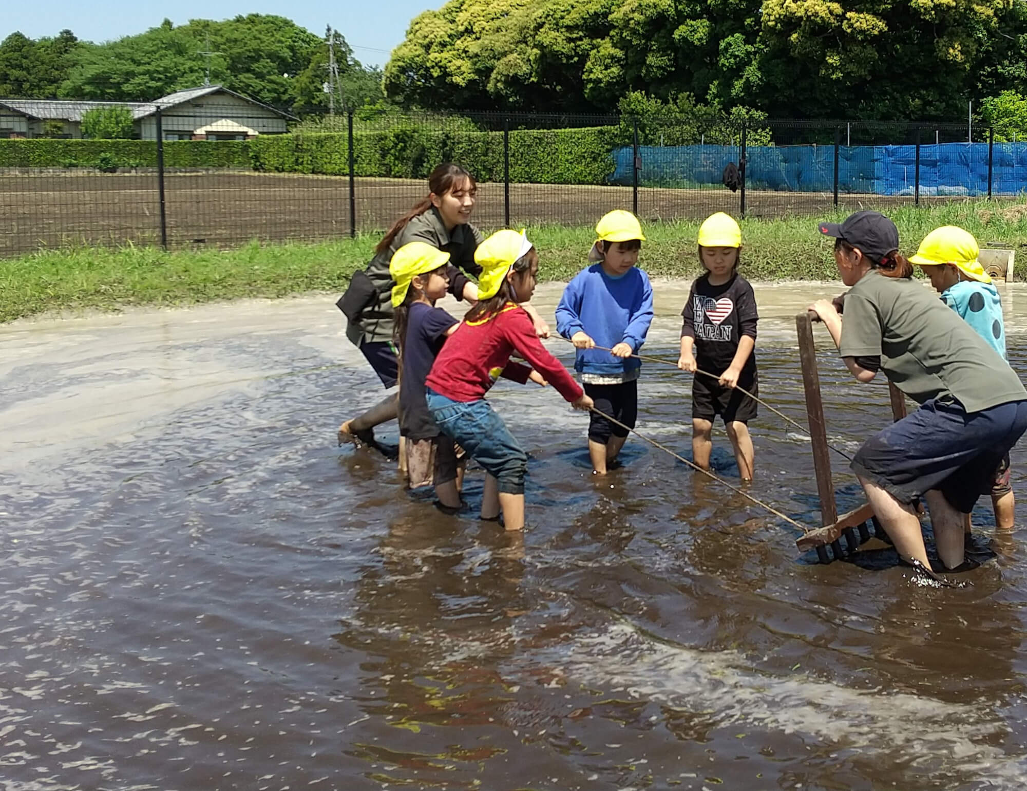 次に行うのは「代掻き」です。田んぼに水を入れ草取りをしたあと、子どもたちが足で土を砕いて均等にしていきます。「馬鍬(まぐわ)」という昔使用されていた道具も体験し、「重い!」「頑張れー!」と友達を応援しあい、より一層力が入っていました。