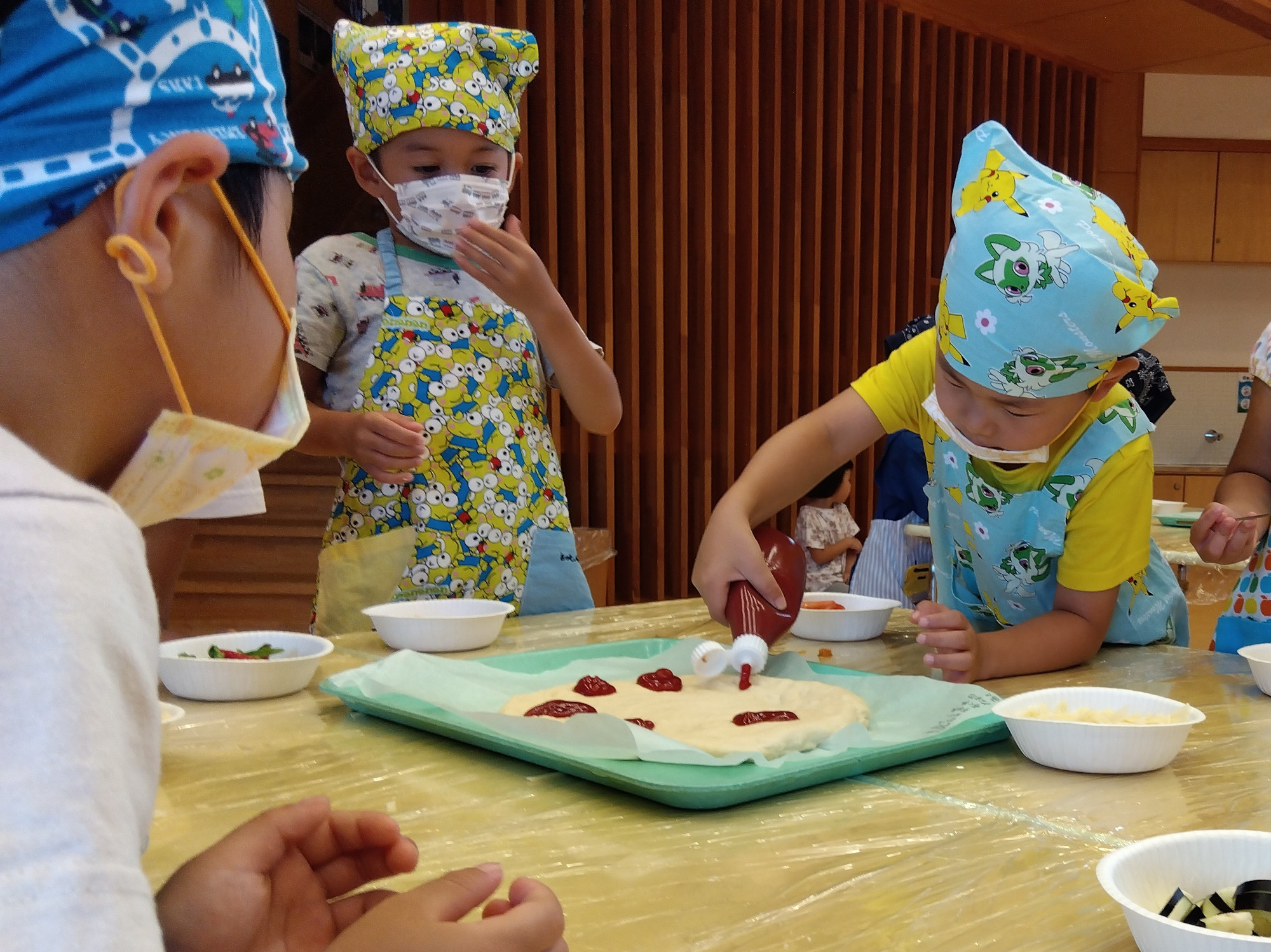 幼児では自分たちで育てた夏野菜を「どうやってのせようかな?」「トマトピザにしようかな?」などと、じっくり考え野菜を丁寧に並べる子、好きな具材を山盛りにする子、顔や模様を作る子など様々な個性あふれるトッピングになりました。