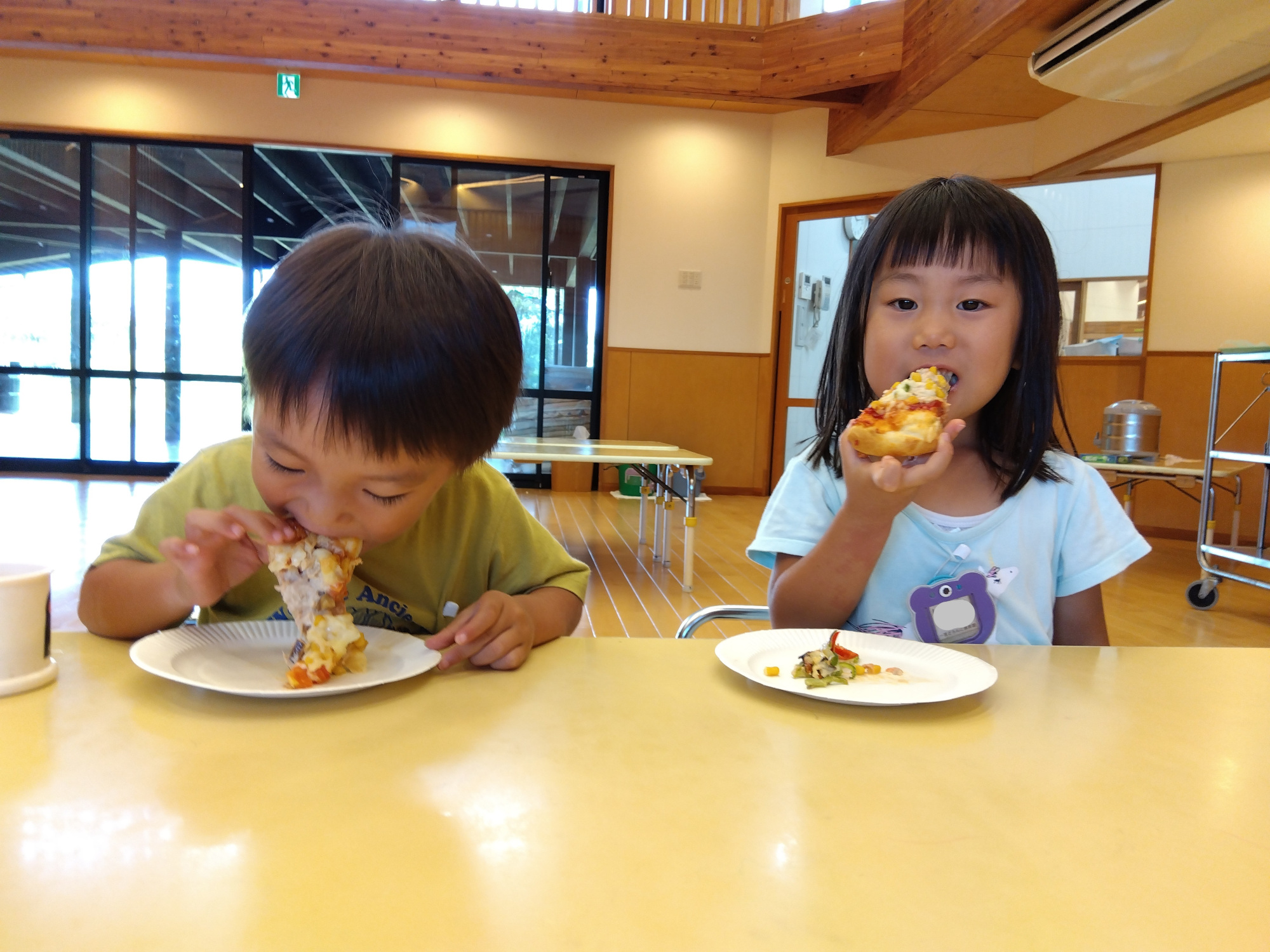 色鮮やかな夏野菜ピザが焼き上がると「良い匂いだね!」「早く食べたい!」部屋いっぱいにピザの匂いが広がり、自分で作ったピザを食べながら「美味しそうだね!」「ピーマン美味しい!」「もっと食べたい!」などと野菜が苦手な子も夢中になって食べる姿が見られていました。