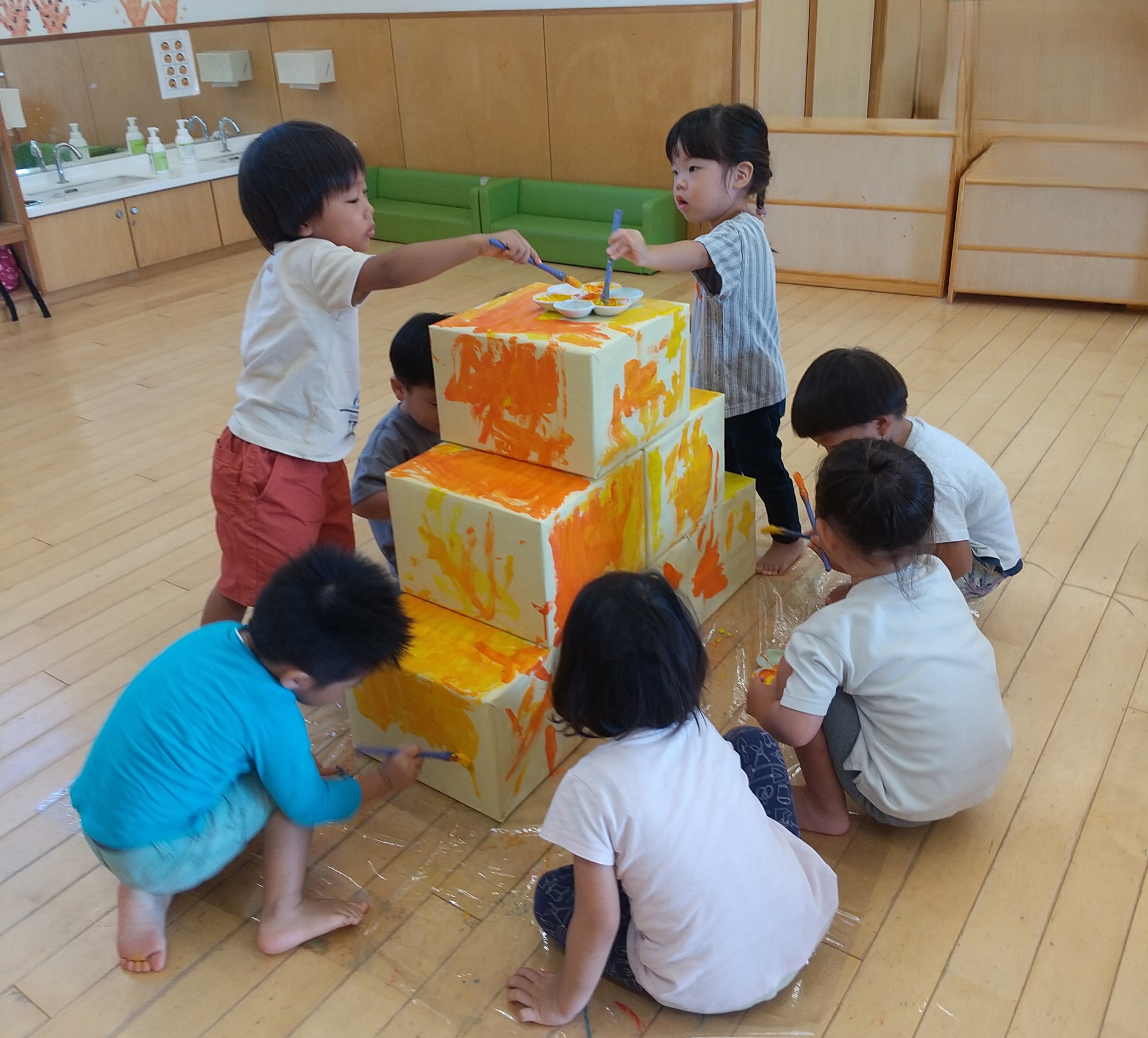 乳児の競技は、世界的なスポーツの祭典が開催をされた「パリ」の街並みを取り入れました。セーヌ川にかかる橋や飛び石、凱旋門、エッフェル塔などをみんなで製作しました。色を塗る子どもたちの目は真剣です。