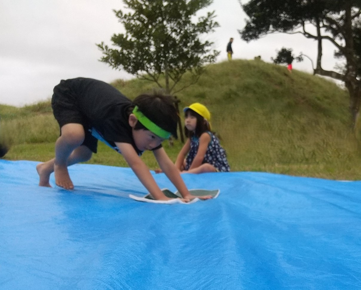 毎年恒例メイン競技「雑巾がけリレー」。園庭をスタートし築山の裏にまわりこみ、2つの築山の間をぬけて園庭に戻り雑巾がけをし、友達に繋げていくリレーです。