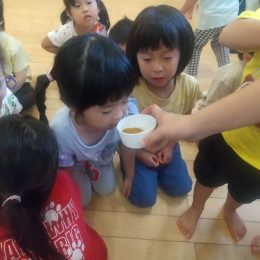 この梅干しも自園で手作りしています。梅干しの種と実に分ける作業をむぎ組が行いました。種に近い実はなかなか取れず、力を入れ、一生懸命に取っていました。梅干しの香りを嗅ぐとすっぱそうな顔も見られました。