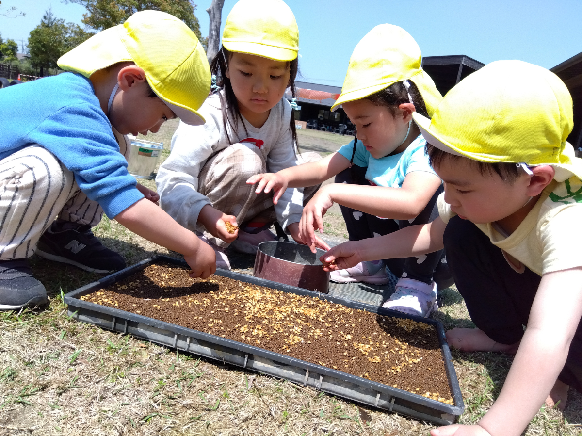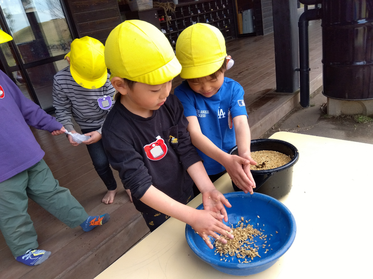 一宮どろんこ保育園では毎年子どもたちと一緒に田植えをおこなっています。今年も去年収穫した米を「種籾」としてとっておいたものを水に入れ選別してから発芽の準備をしました。水に入れて浮かんでくる種籾は実が入っていません。