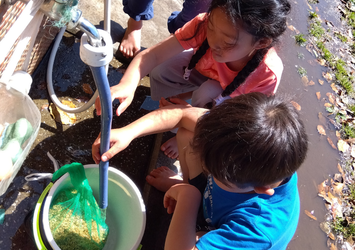 みんなで選別した種籾をネットに入れ、バケツにたっぷりの水を汲んだ中に浸します。この作業を「浸種」と言い、子どもたちと10日間毎日水を換えながら観察をし、水換え時には「ちょっとくさいな!」「バナナみたいな匂いがする!」などと匂いの変化を感じていました。
