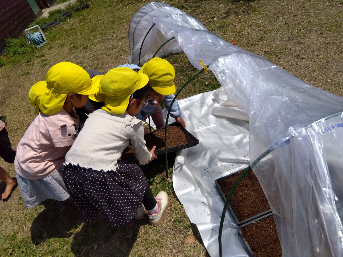 種をまいた後は再度上から優しく土を被せ、みんなで作ったビニールハウスの中へそっと運びます。「そっと!そっとだよ!」「ゆっくりね!」などと慎重に置いていました。更に上からシートを被せ、発芽まで温度調整をしながら毎日子どもたちと観察をし、育てていきます。「おおきくなーれ!」と子どもたちも生長を楽しみにしています。