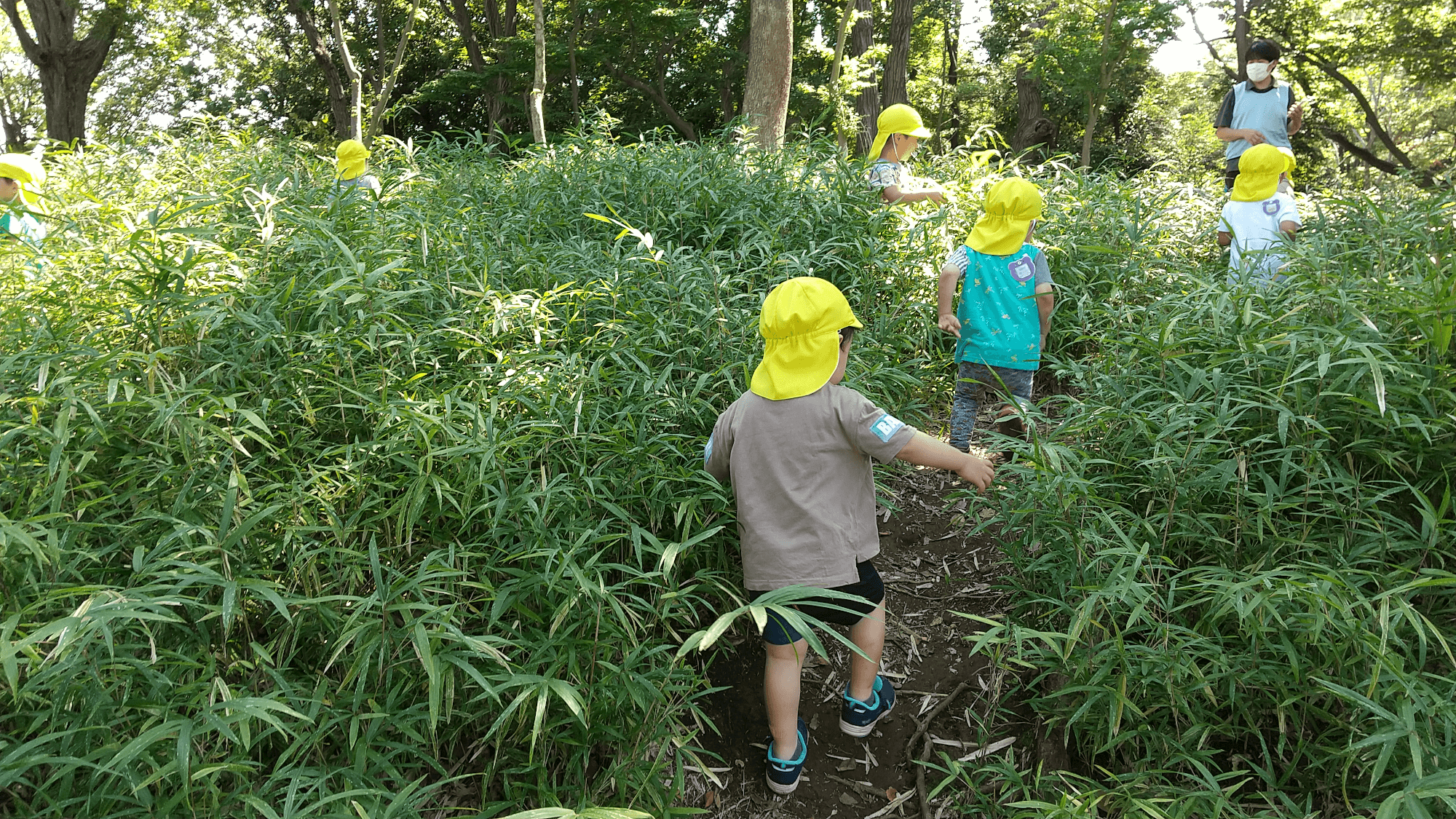 普段遊んでいる公園も子どもの発達を助けてくれます。上の写真は斜面の茂みの中を元気いっぱいに走り回っている2歳児です。転んでもすぐに立ち上がり笑顔で走る姿が保育者の誇りでもあるのです。