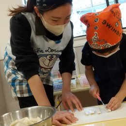 子どもたちも餅をついた後は、5歳児が鏡餅の形成をしました。手にペタペタとくっつく感覚を楽しみながらも、どうやったら手につきにくくなるか、さまざまな方法を考えながら形作っていきました。最後は、ミカンを乗せて新年を迎える準備をしました。