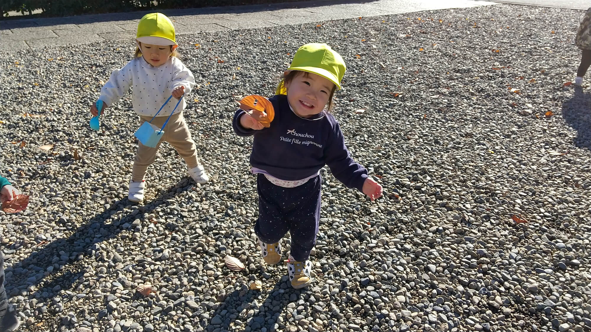 境内では広いスペースを使って、走る遊びを活発に楽しんでいました。運動会で楽しんだ、「よーいどん」をきっかけに、お化けに見立てた葉っぱを使ったおいかけっこや、しっぽとりなどの遊びに発展していく姿がありました。