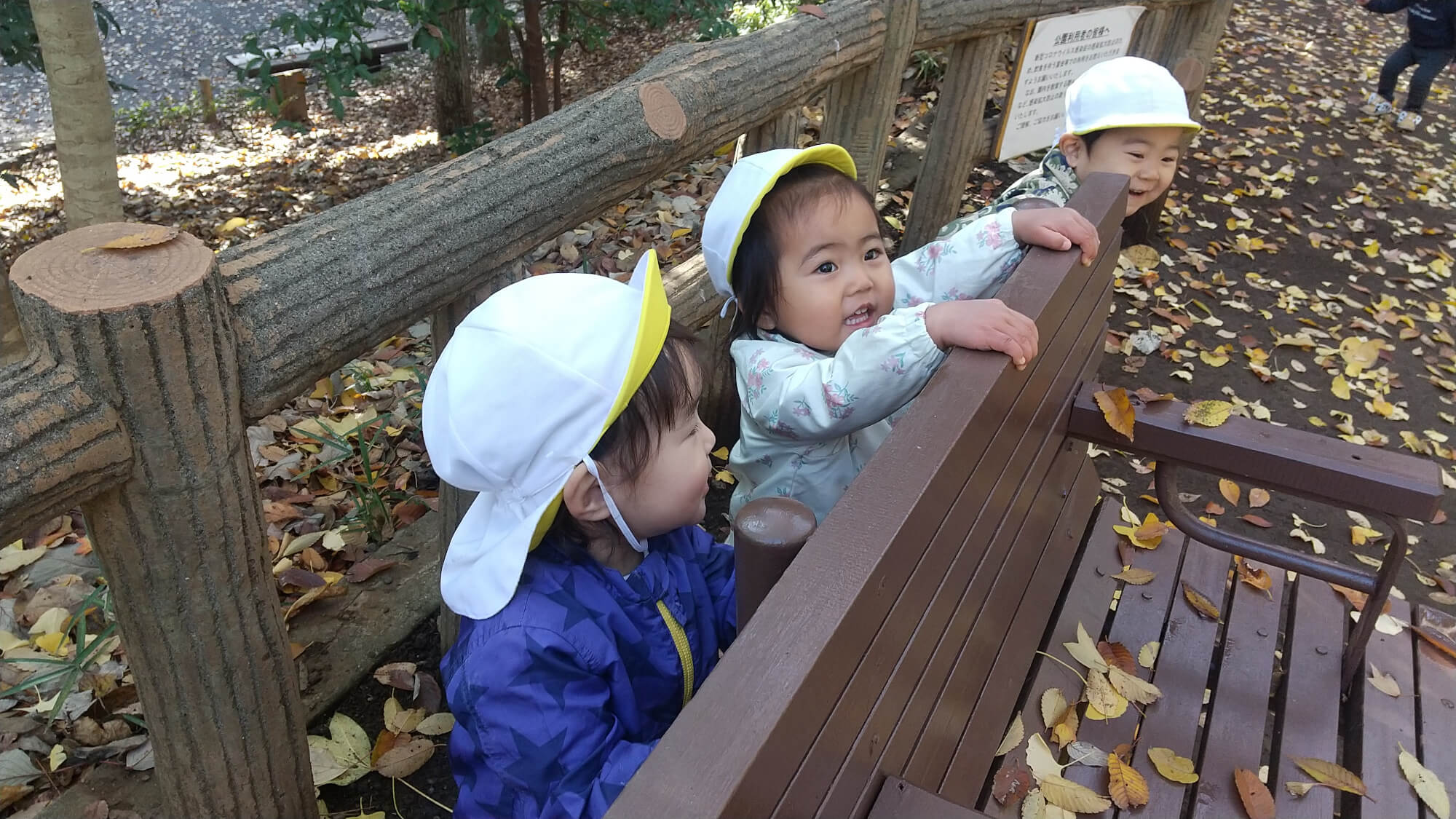 また、どんぐり広場では、ベンチや大きな木でかくれんぼを楽しんでいました。「しー!」「もういいかい」「みーつけた!」などと、友だち同士でやりとりしながら、戸外で活発に遊ぶ姿が見られていました。