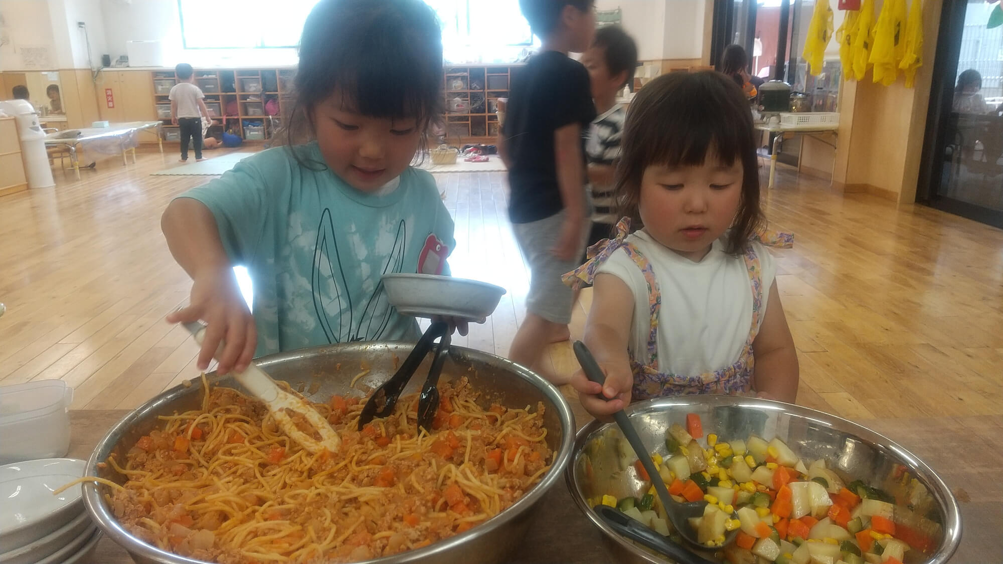 新しく幼児クラスになった3歳児もバイキング形式の盛り付けに慣れてきて、みんなが好きな量を準備できるようになり完食できることが増えてきました。また、おかわりへの意欲も上がってきています。