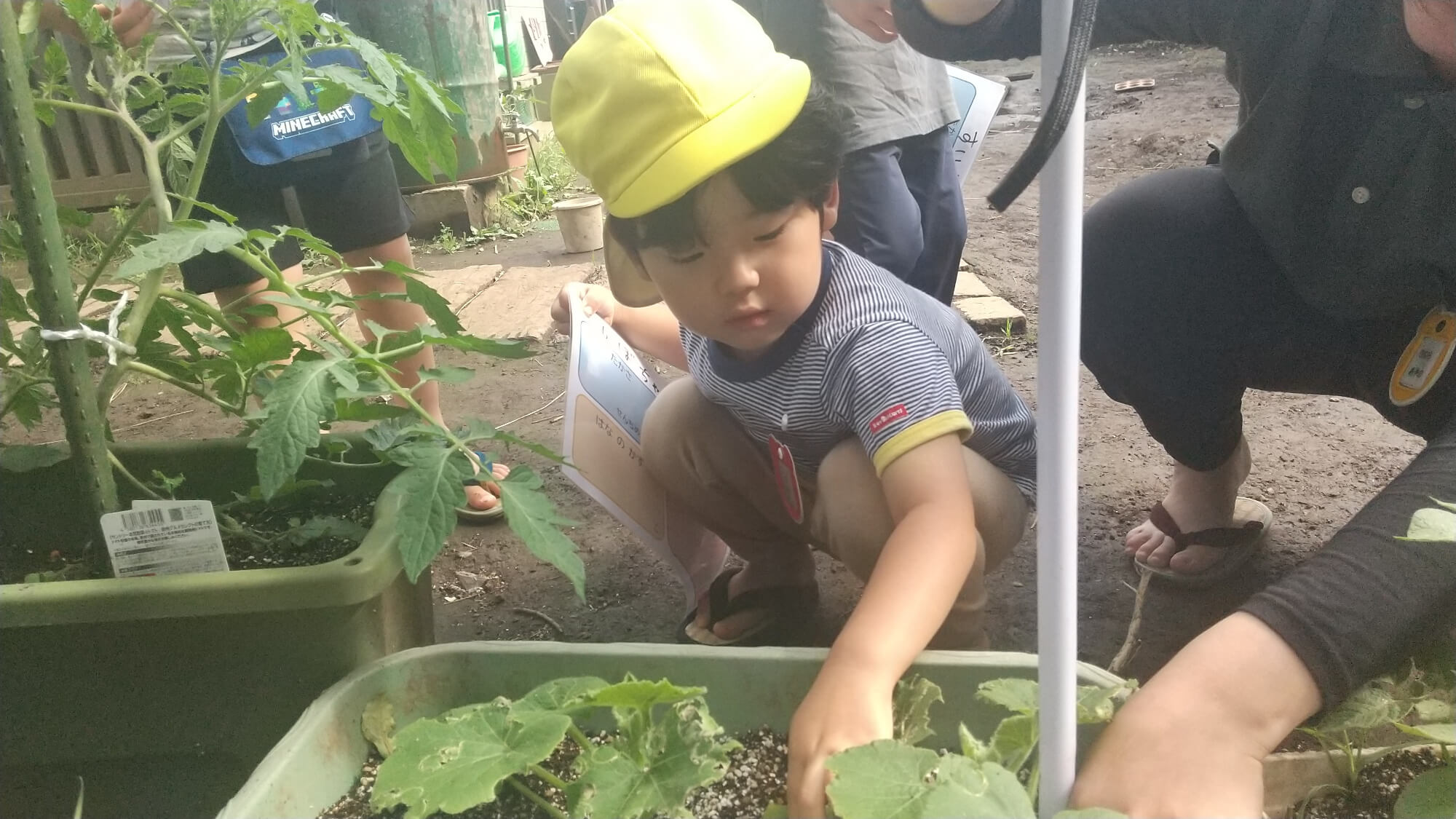 現在畑にはジャガイモやナス、トマトなどの夏野菜が植えられています。これまで実がなり始めるまであまり興味が持てない様子が見られていました。そこで、毎日の変化に注目できるように当番で葉っぱの数や長さを記録して帰りの会で発表するようにしました。