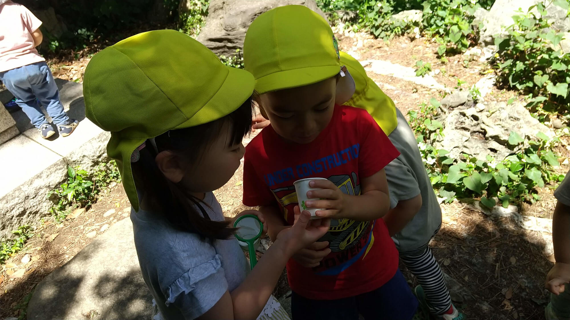 虫メガネを使って植物や虫の観察をしました。大きく見えることで「これが目じゃない?」「食べ物運んでるよ!」とより虫に興味が出てきているようです。