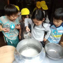 初め、だいず組(3歳児)はストローでブクブクと息を吹くのに苦戦しましたが、保育者に教わりながらそばで何度もやってみるうちに泡が出来るようになり、泡立つ様子を楽しんでいました。