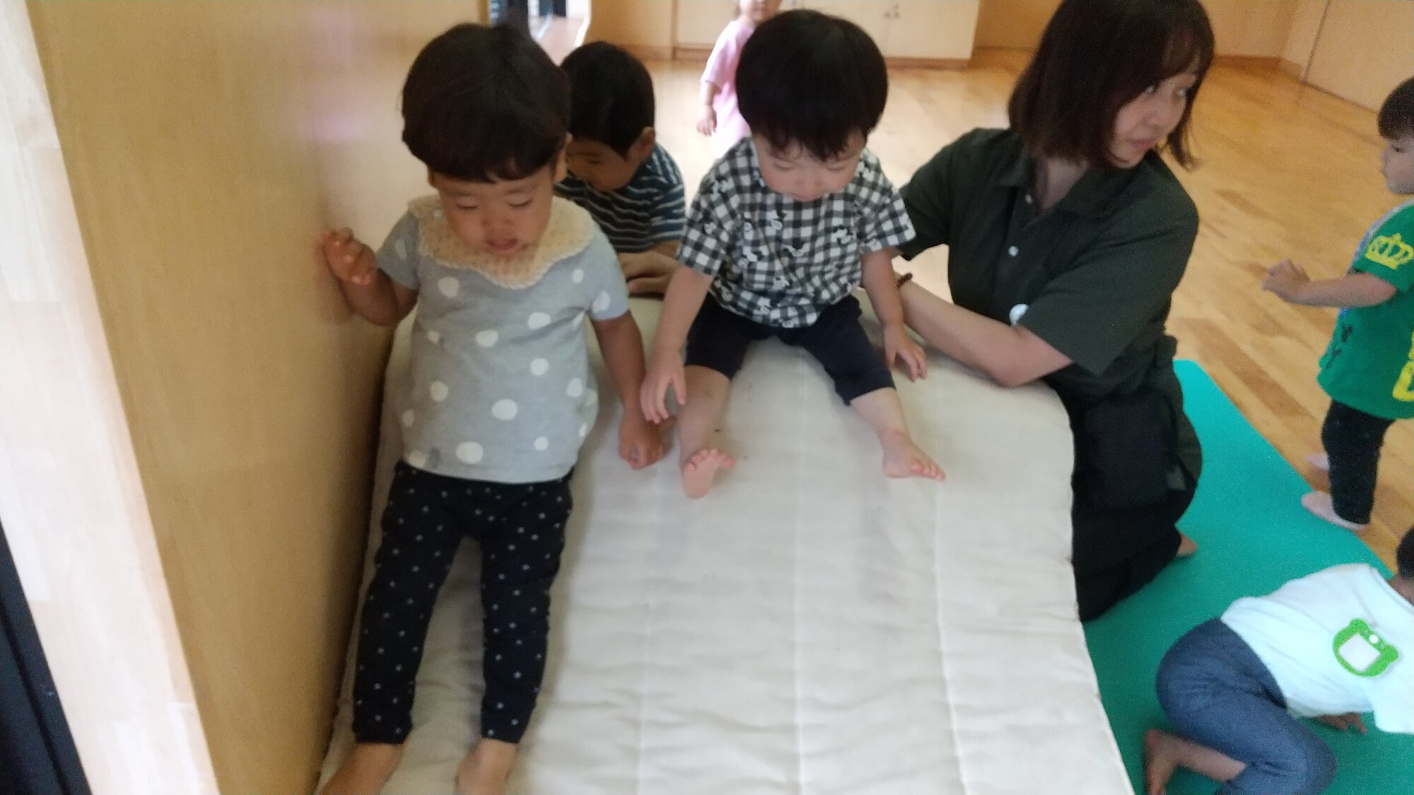 室内には、鉄棒やマットの山、はしご、ボールプール等、様々な運動遊びが出来るように準備しました。慣れると自分の力でも登れるようになり、「一緒にすべろ~!」というように友達を誘う姿も見られました。