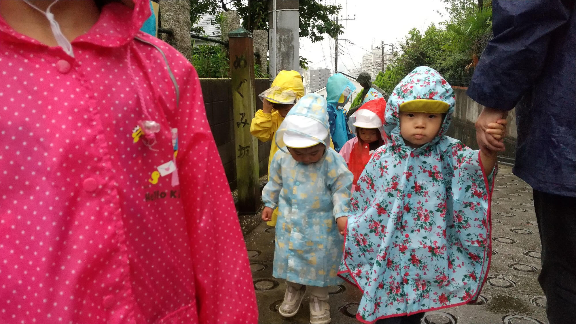 ひえ組(1歳児)でレインコートを着て雨の道を歩きました。普段は避けている水溜まりにも思い切り入って、水が跳ねる様子や濡れる感触に大はしゃぎでした。